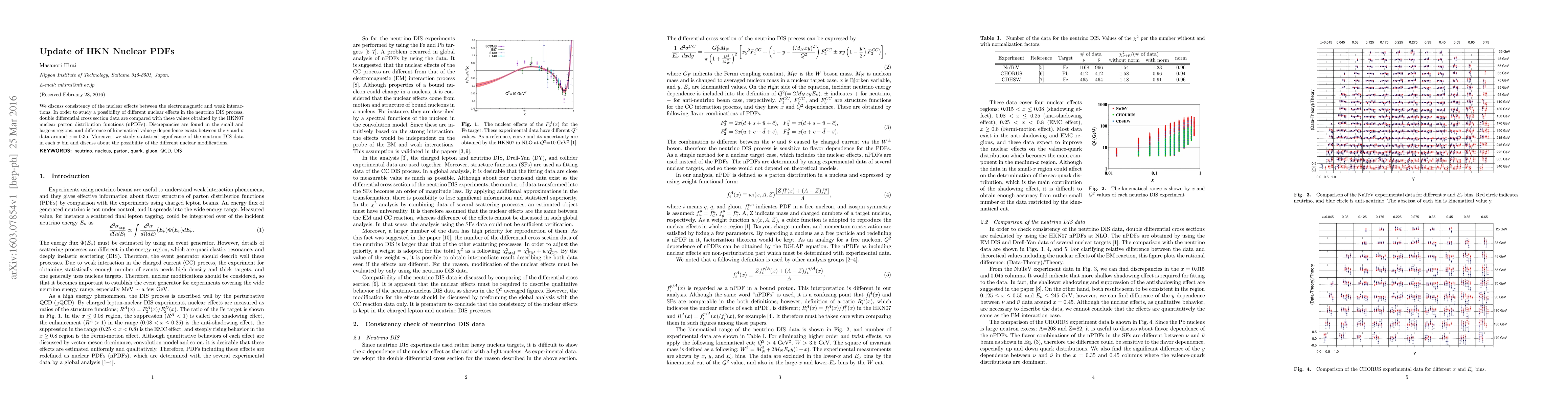 We discuss consistency of the nuclear effects between the electromagnetic and weak interactions. In order to study a possibility of different nuclear effects in the neutrino DIS process, double differential cross section data are compared with these values obtained by the HKN07 nuclear parton distribution functions (nPDFs). Discrepancies are found in the small and large-$x$ regions, and difference of kinematical value $y$ dependence exists between the $\nu$ and $\bar{\nu}$ data around $x=0.35$. Moreover, we study statistical significance of the neutrino DIS data in each $x$ bin and discuss about the possibility of the different nuclear modifications.