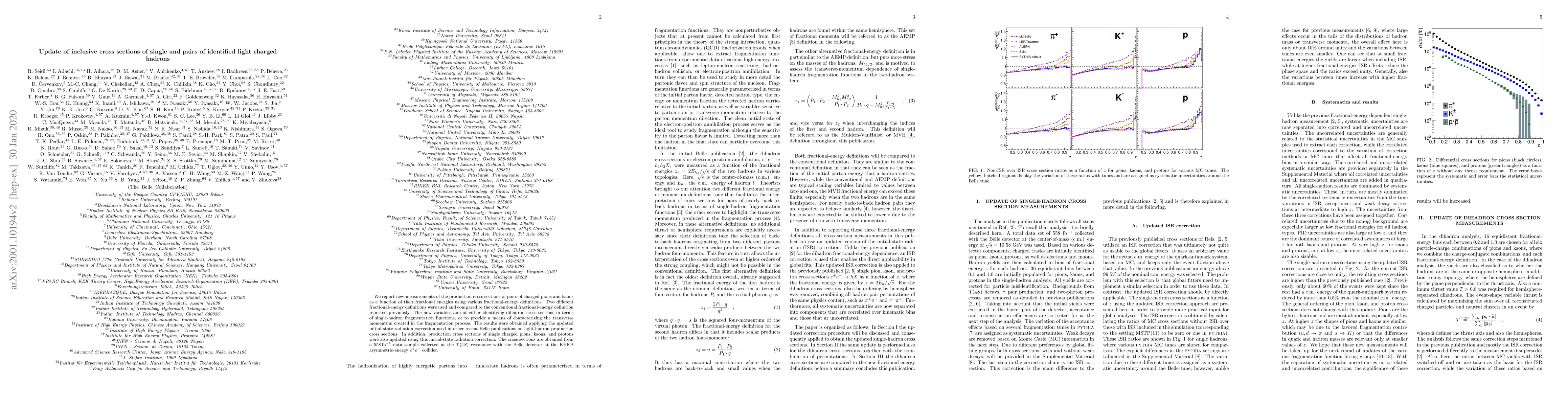 We report new measurements of the production cross sections of pairs of charged pions and kaons as a function of their fractional energies using various fractional-energy definitions. Two different fractional-energy definitions were used and compared to the conventional fractional-energy definition reported previously. The new variables aim at either identifying dihadron cross sections in terms of single-hadron fragmentation functions, or to provide a means of characterizing the transverse momentum created in the fragmentation process. The results were obtained applying the updated initial-state radiation correction used in other recent Belle publications on light-hadron production cross sections. In addition, production cross sections of single charged pions, kaons, and protons were also updated using this initial-state radiation correction. The cross sections are obtained from a $558\,{\rm fb}^{-1}$ data sample collected at the $\Upsilon(4S)$ resonance with the Belle detector at the KEKB asymmetric-energy $e^+ e^-$ collider.