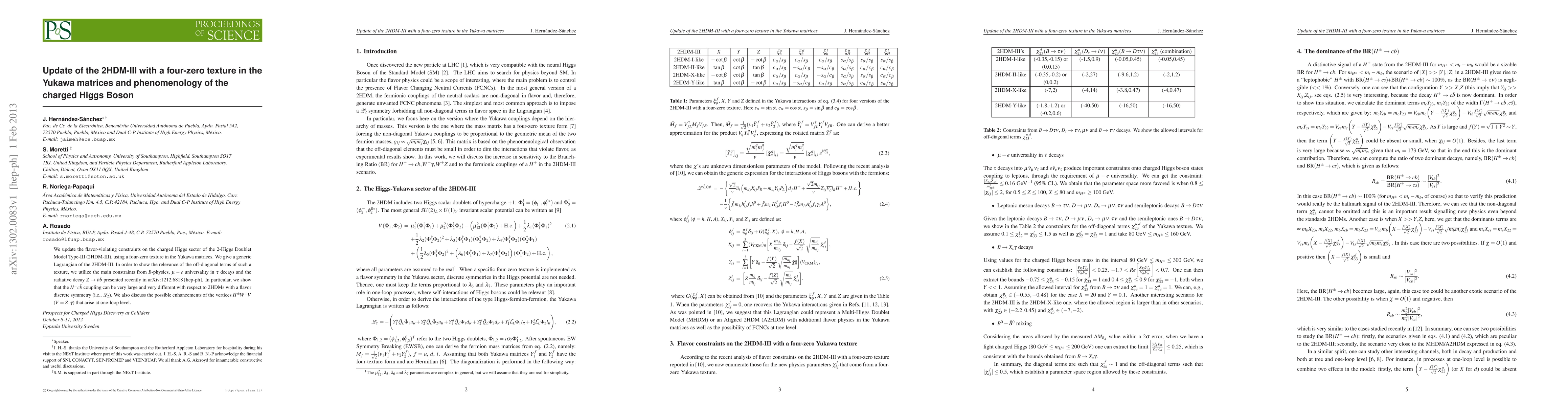 This paper updates the charged Higgs sector of the 2HDM-III model with a four-zero texture in Yukawa matrices, exploring flavor-violating constraints and the phenomenology of the charged Higgs boson. It highlights significant off-diagonal terms and discusses potential enhancements in $H^\pm W^\mp V$ vertices.