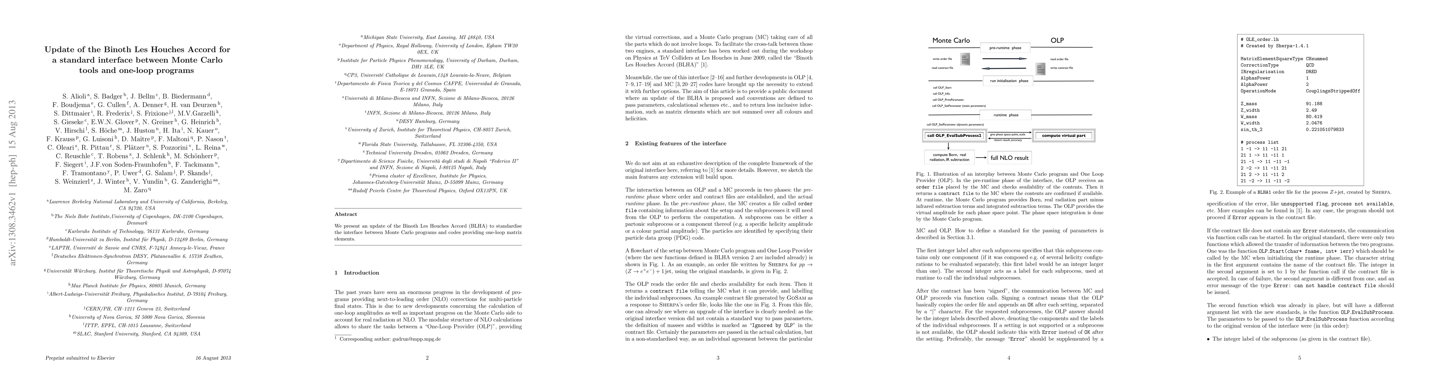 This update to the Binoth Les Houches Accord standardizes the interface between Monte Carlo programs and one-loop matrix element codes, facilitating seamless integration and calculation consistency in particle physics simulations.