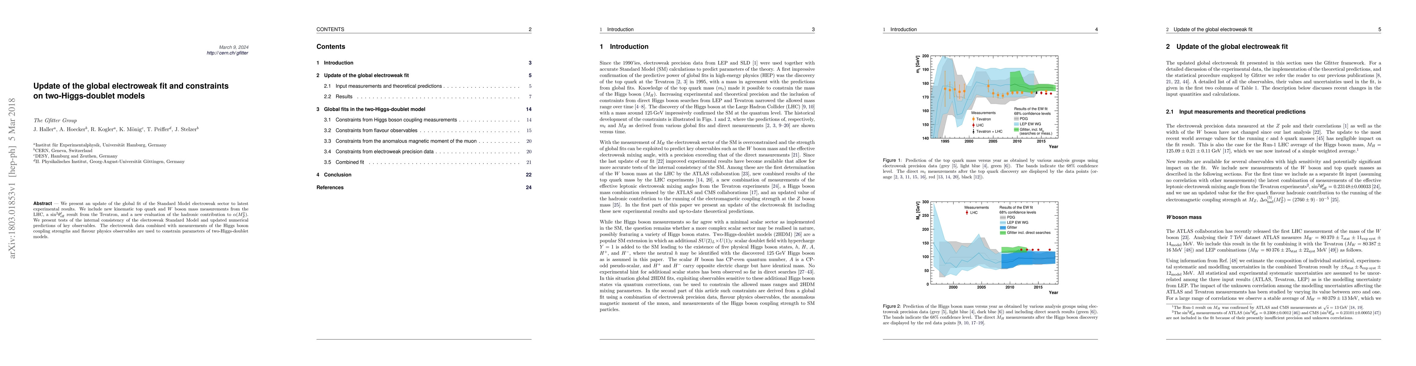 We present an update of the global fit of the Standard Model electroweak sector to latest experimental results. We include new kinematic top quark and $W$ boson mass measurements from the LHC, a $\sin^2\theta^{\ell}_{\mathrm{eff}}$ result from the Tevatron, and a new evaluation of the hadronic contribution to $\alpha(M_Z^2)$. We present tests of the internal consistency of the electroweak Standard Model and updated numerical predictions of key observables. The electroweak data combined with measurements of the Higgs boson coupling strengths and flavour physics observables are used to constrain parameters of two-Higgs-doublet models.