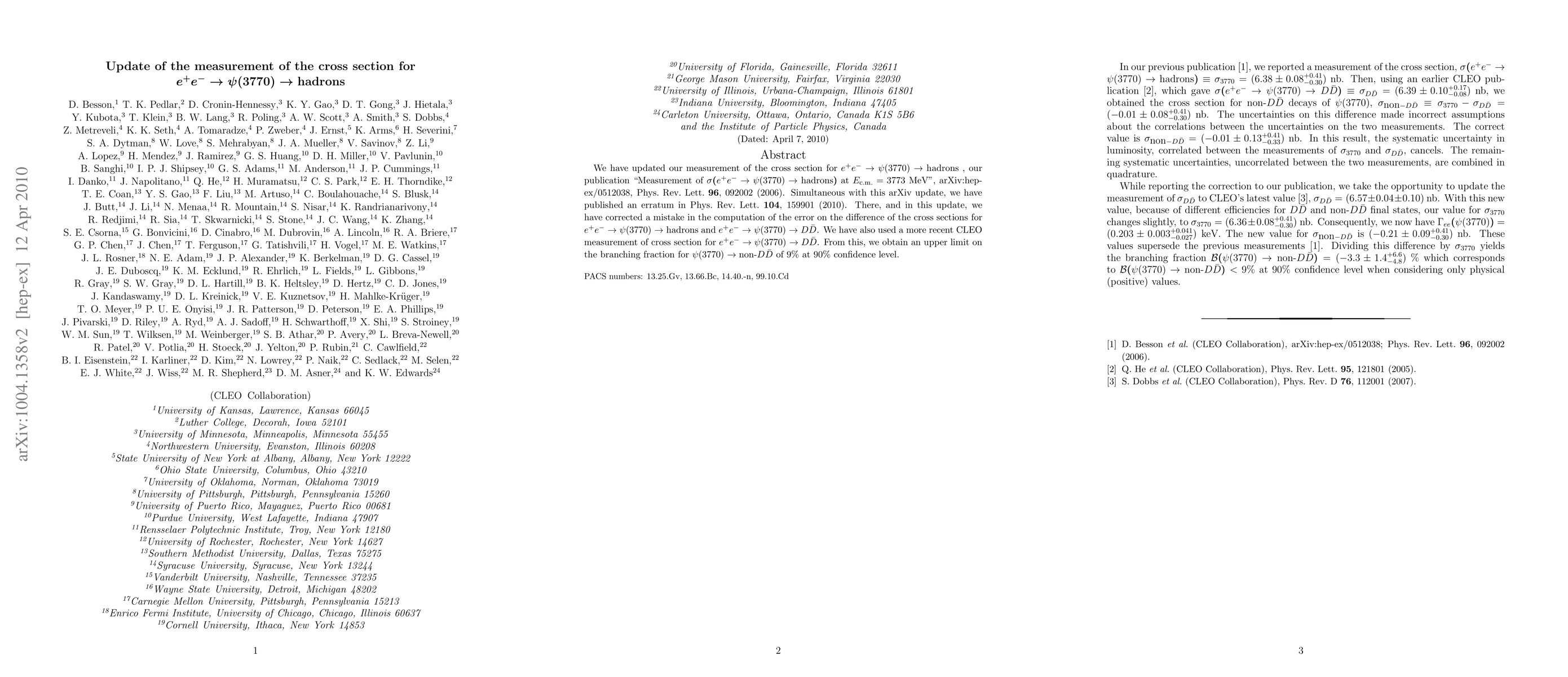 We have updated our measurement of the cross section for e^+e^- -> psi(3770) -> hadrons, our publication "Measurement of sigma(e^+e^- -> psi(3770) -> hadrons) at E_{c.m.} = 3773 MeV", arXiv:hep-ex/0512038, Phys.Rev.Lett.96, 092002 (2006). Simultaneous with this arXiv update, we have published an erratum in Phys.Rev.Lett.104, 159901 (2010). There, and in this update, we have corrected a mistake in the computation of the error on the difference of the cross sections for e^+e^- -> psi(3770) -> hadrons and e^+e^- -> psi(3770) -> DDbar. We have also used a more recent CLEO measurement of cross section for e^+e^- -> psi(3770) -> DDbar. From this, we obtain an upper limit on the branching fraction for psi(3770) -> non-DDbar of 9% at 90% confidence level.