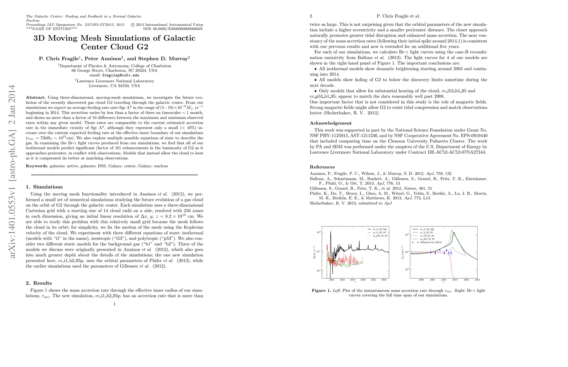 Using three-dimensional, moving-mesh simulations, we investigate the future evolution of the recently discovered gas cloud G2 traveling through the galactic center. From our simulations we expect an average feeding rate onto Sgr A* in the range of $(5-19) \times 10^{-8} M_\odot\mathrm{~yr}^{-1}$ beginning in 2014. This accretion varies by less than a factor of three on timescales of about 1 month, and shows no more than a factor of 10 difference between the maximum and minimum observed rates within any given model. These rates are comparable to the current estimated accretion rate in the immediate vicinity of Sgr A*, although they represent only a small (<10%) increase over the current expected feeding rate at the effective inner boundary of our simulations $(r_\mathrm{acc} = 750 R_S \sim 10^{15} \mathrm{cm})$. We also explore multiple possible equations of state to describe the gas. In examining the Br-$\gamma$ light curves produced from our simulations, we find that all of our isothermal models predict significant (factor of 10) enhancements in the luminosity of G2 as it approaches pericenter, in conflict with observations. Models that instead allow the cloud to heat as it is compressed do better at matching observations.