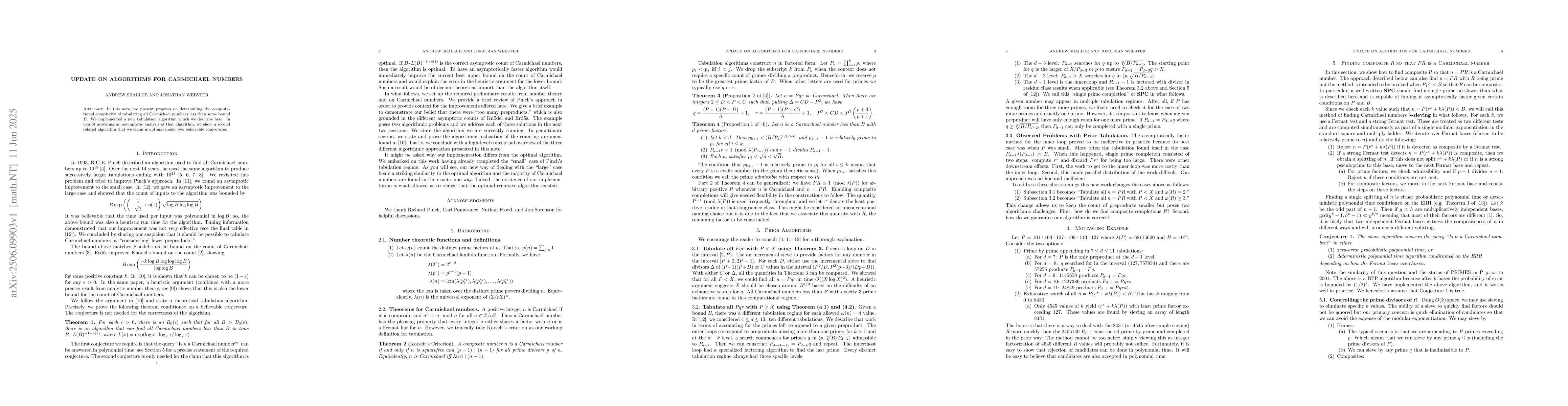 In this note, we present progress on determining the computational complexity of tabulating all Carmichael numbers less than some bound $B$. We implemented a new tabulation algorithm which we describe here. In lieu of providing an asymptotic analysis of that algorithm, we show a second related algorithm that we claim is optimal under two believable conjectures.