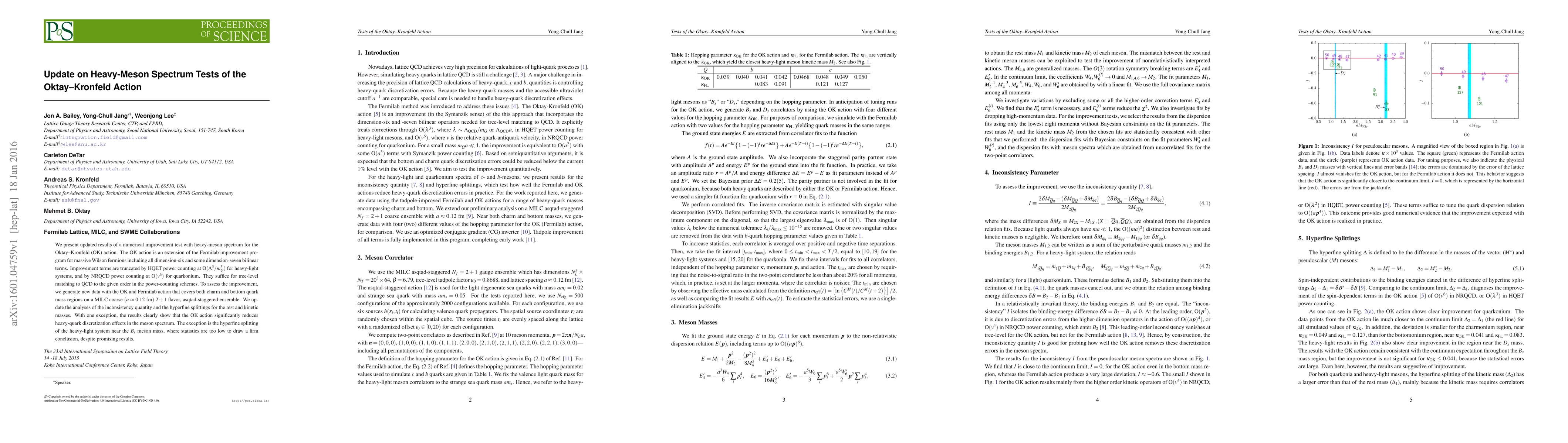 We present updated results of a numerical improvement test with heavy-meson spectrum for the Oktay--Kronfeld (OK) action. The OK action is an extension of the Fermilab improvement program for massive Wilson fermions including all dimension-six and some dimension-seven bilinear terms. Improvement terms are truncated by HQET power counting at $\mathrm{O}(\Lambda^3/m_Q^3)$ for heavy-light systems, and by NRQCD power counting at $\mathrm{O}(v^6)$ for quarkonium. They suffice for tree-level matching to QCD to the given order in the power-counting schemes. To assess the improvement, we generate new data with the OK and Fermilab action that covers both charm and bottom quark mass regions on a MILC coarse $(a \approx 0.12~\text{fm})$ $2+1$ flavor, asqtad-staggered ensemble. We update the analyses of the inconsistency quantity and the hyperfine splittings for the rest and kinetic masses. With one exception, the results clearly show that the OK action significantly reduces heavy-quark discretization effects in the meson spectrum. The exception is the hyperfine splitting of the heavy-light system near the $B_s$ meson mass, where statistics are too low to draw a firm conclusion, despite promising results.