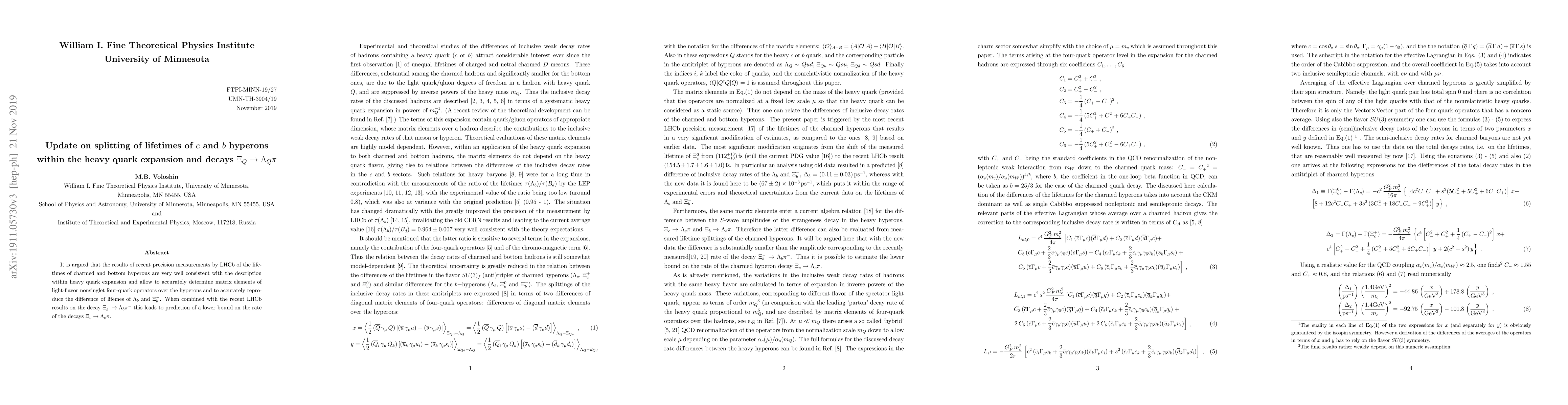 It is argued that the results of recent precision measurements by LHCb of the lifetimes of charmed and bottom hyperons are very well consistent with the description within heavy quark expansion and allow to accurately determine matrix elements of light-flavor nonsinglet four-quark operators over the hyperons and to accurately reproduce the difference of lifemes of $\Lambda_b$ and $\Xi_b^-$. When combined with the recent LHCb results on the decay $\Xi_b^- \to \Lambda_b \pi^-$ this leads to prediction of a lower bound on the rate of the decays $\Xi_c \to \Lambda_c \pi$.
