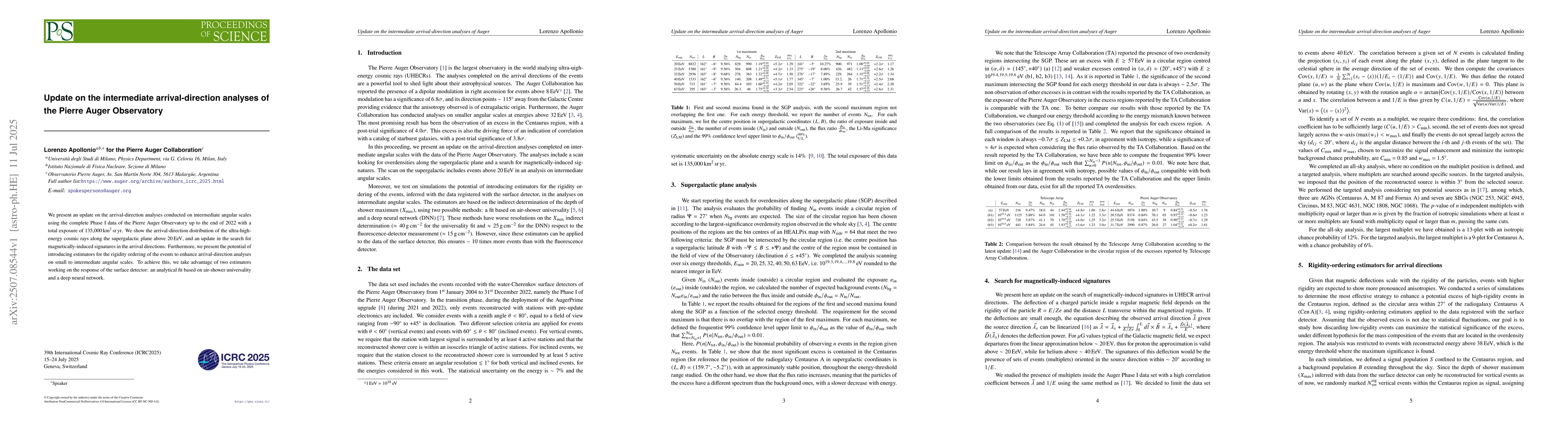 We present an update on the arrival-direction analyses conducted on intermediate angular scales using the complete Phase I data of the Pierre Auger Observatory up to the end of $2022$ with a total exposure of $135{,}000\,\text{km}^2\,\text{sr}\,\text{yr}$. We show the arrival-direction distribution of the ultra-high-energy cosmic rays along the supergalactic plane above $20\,\text{EeV}$, and an update in the search for magnetically-induced signatures in the arrival directions. Furthermore, we present the potential of introducing estimators for the rigidity ordering of the events to enhance arrival-direction analyses on small to intermediate angular scales. To achieve this, we take advantage of two estimators working on the response of the surface detector: an analytical fit based on air-shower universality and a deep neural network.