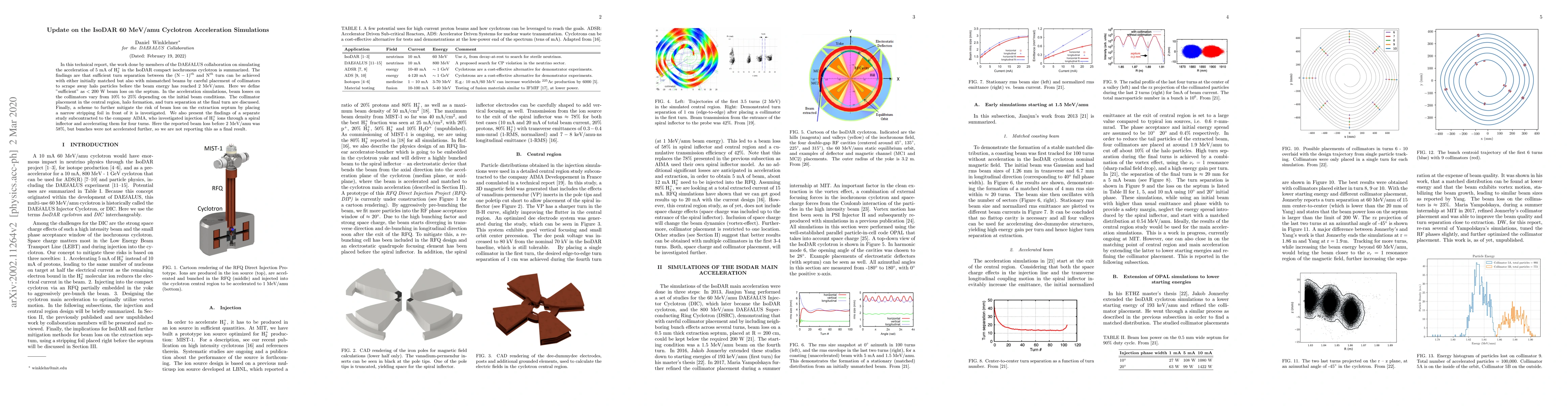 In this technical report, the work done by members of the DAE$\delta$ALUS collaboration on simulating the acceleration of 5 mA of H2+ in the IsoDAR compact isochronous cyclotron is summarized. The findings are that sufficient turn separation between the (N-1)th and Nth turn can be achieved with either initially matched but also with mismatched beams by careful placement of collimators to scrape away halo particles before the beam energy has reached 2 MeV/amu. Here we define "sufficient" as < 200 W beam loss on the septum. In the acceleration simulations, beam losses on the collimators vary from 10% to 25% depending on the initial beam conditions. The collimator placement in the central region, halo formation, and turn separation at the final turn are discussed. Finally, a scheme to further mitigate the risk of beam loss on the extraction septum by placing a narrow stripping foil in front of it is investigated. We also present the findings of a separate study subcontracted to the company AIMA, who investigated injection of H2+ ions through a spiral inflector and accelerating them for four turns. Here the reported beam loss before 2 MeV/amu was 58%, but bunches were not accelerated further, so we are not reporting this as a final result.