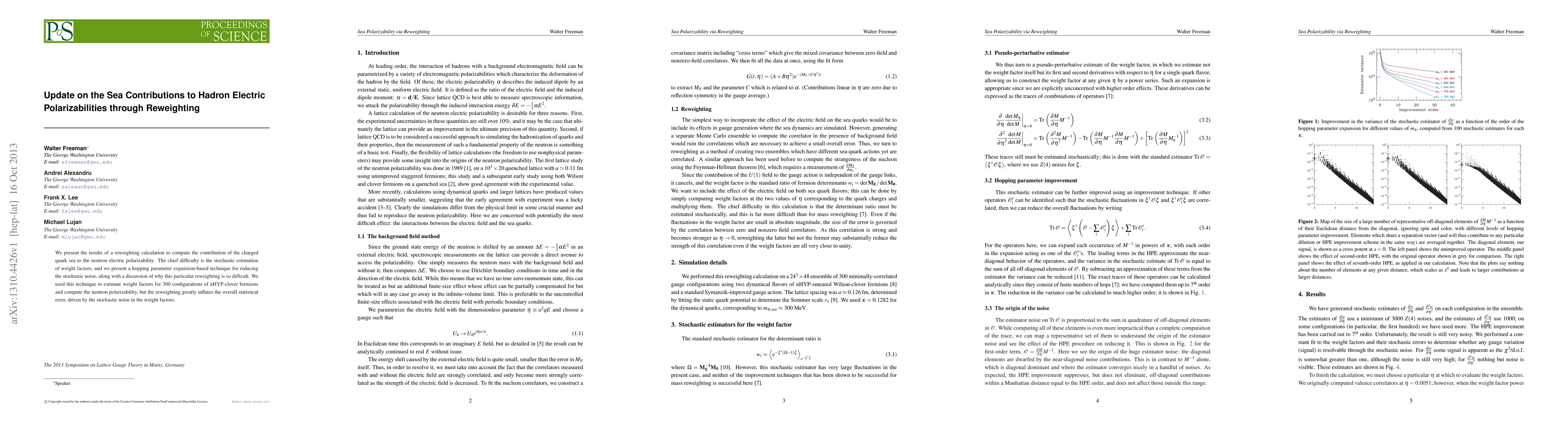 We present the results of a reweighting calculation to compute the contribution of the charged quark sea to the neutron electric polarizability. The chief difficulty is the stochastic estimation of weight factors, and we present a hopping parameter expansion-based technique for reducing the stochastic noise, along with a discussion of why this particular reweighting is so difficult. We used this technique to estimate weight factors for 300 configurations of nHYP-clover fermions and compute the neutron polarizability, but the reweighting greatly inflates the overall statistical error, driven by the stochastic noise in the weight factors.