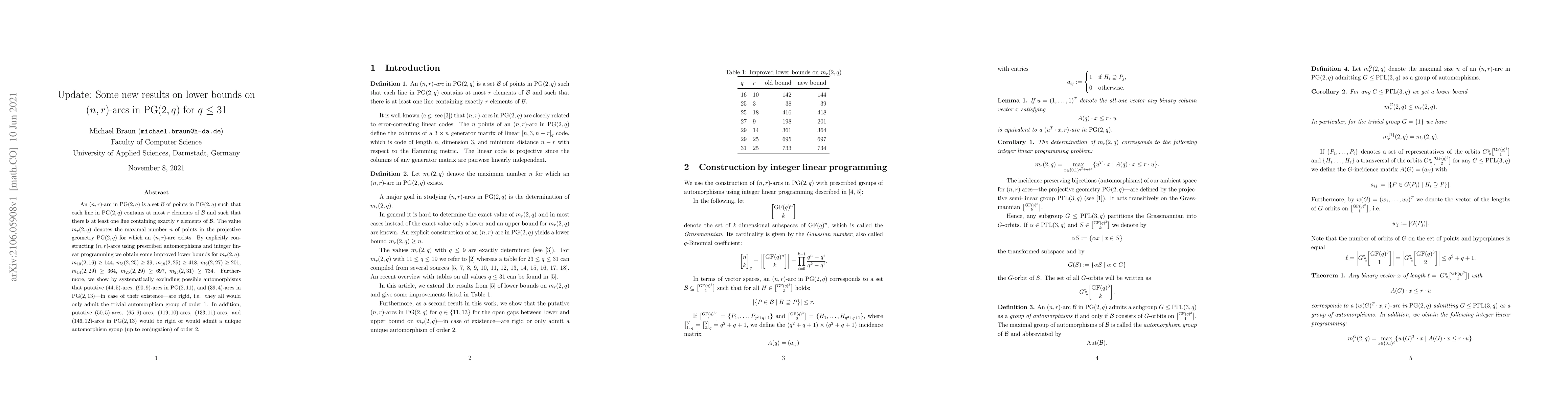 Researchers found improved lower bounds for (n,r)-arcs in projective geometry PG(2,q), including new records for some parameters, and showed that certain large arcs would be rigid under specific automorphisms.