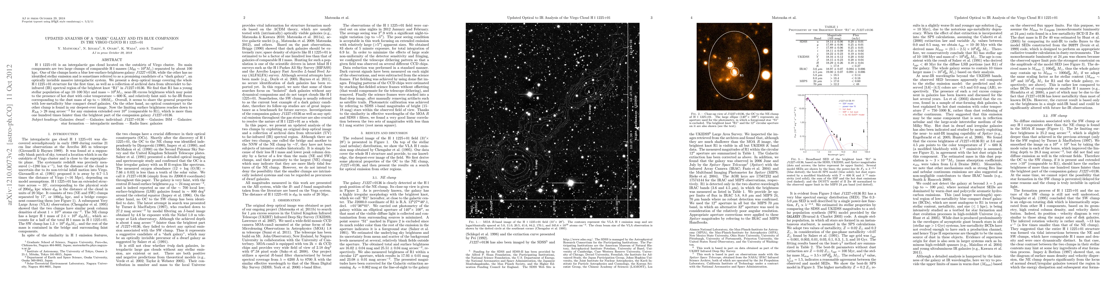HI 1225+01 is an intergalactic gas cloud located on the outskirts of Virgo cluster. Its main components are two large clumps of comparable HI masses (M_HI ~ 10^9 Msun) separated by about 100 kpc. One of the clumps hosts a blue low-surface-brightness galaxy J1227+0136, while the other has no identified stellar emission and is sometimes referred to as a promising candidate of a "dark galaxy", an optically invisible massive intergalactic system. We present a deep optical image covering the whole HI 1225+01 structure for the first time, as well as a collection of archival data from ultraviolet to far-infrared (IR) spectral region of the brightest knot "R1" in J1227+0136. We find that R1 has a young stellar population of age 10-100 Myr and mass ~ 10^6 Msun, near-IR excess brightness which may point to the presence of hot dust with color temperature ~ 600 K, and relatively faint mid- to far-IR fluxes corresponding to the dust mass of up to ~ 100 Msun. Overall, it seems to share the general properties with low-metallicity blue compact dwarf galaxies. On the other hand, no optical counterpart to the other clump is found in our deepest-ever image. Now the limiting surface brightness reaches down to R_AB > 28 mag/arcsec2 for any emission extended over 10" (comparable to R1), which is more than one hundred times fainter than the brightest part of the companion galaxy J1227+0136.