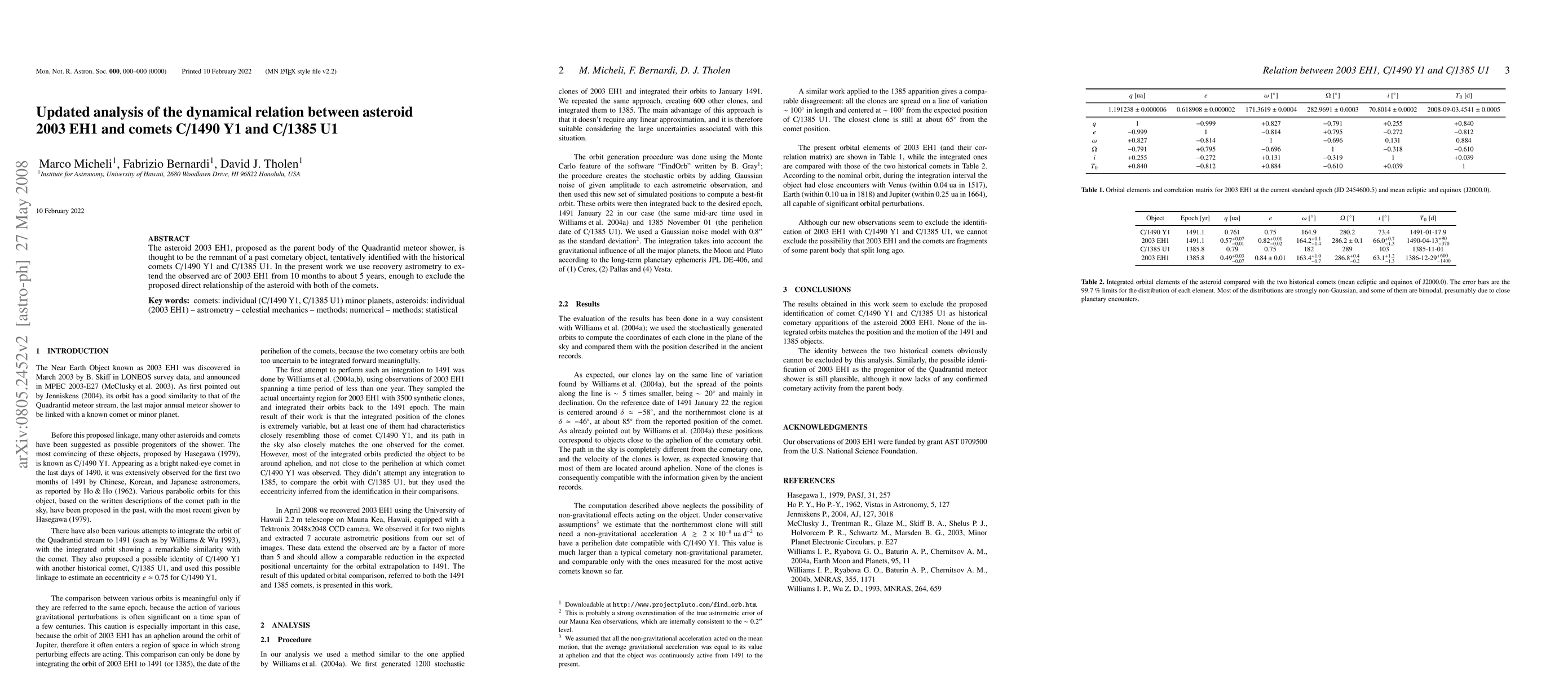 This study uses extended astrometry to analyze the dynamical connection between asteroid 2003 EH1 and historical comets C/1490 Y1 and C/1385 U1, concluding that there is no direct relationship between the asteroid and the comets.