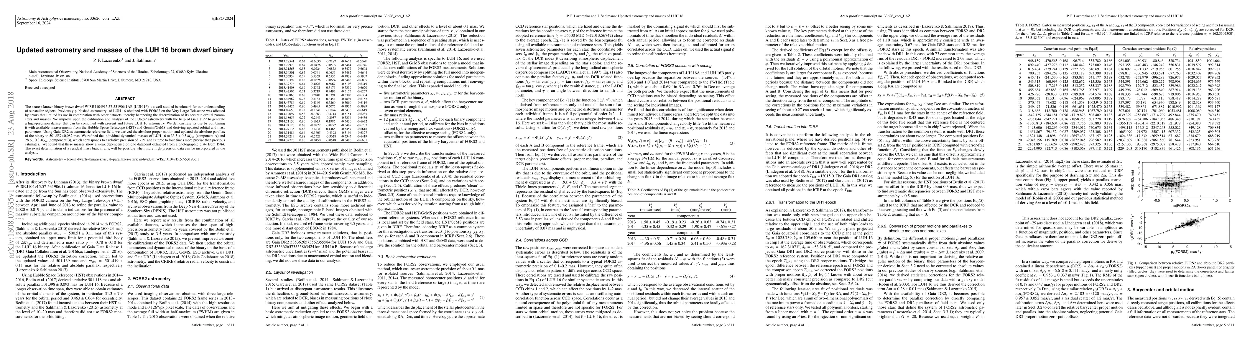 This paper presents improved astrometry and mass estimates for the binary brown dwarf LUH 16 using high-precision data from Gaia DR2, HST, and Gemini/GeMS. The refined masses for components A and B are 33.5 +/- 0.3 M[Jupiter] and 28.6 +/- 0.3 M[Jupiter], respectively, providing a significant improvement over previous estimates.