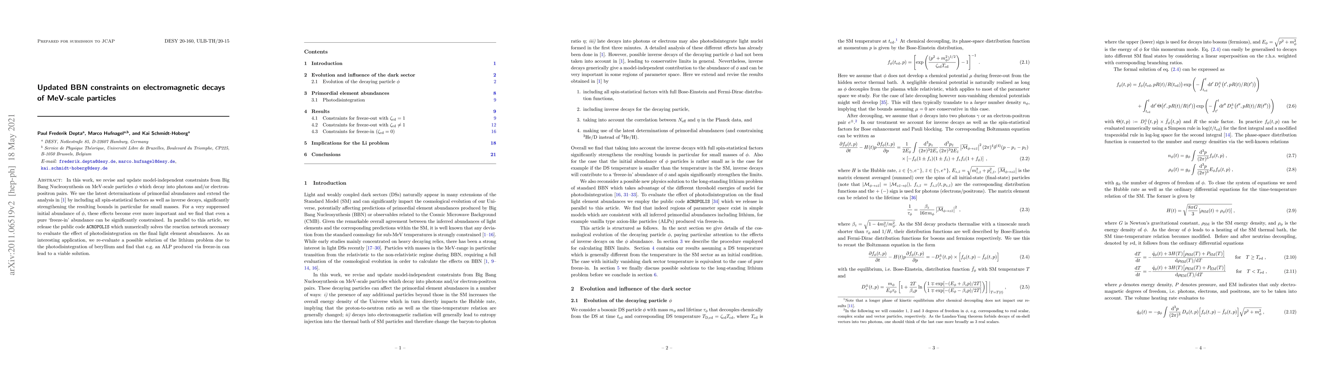 In this work, we revise and update model-independent constraints from Big Bang Nucleosynthesis on MeV-scale particles $\phi$ which decay into photons and/or electron-positron pairs. We use the latest determinations of primordial abundances and extend the analysis in arXiv:1808.09324 by including all spin-statistical factors as well as inverse decays, significantly strengthening the resulting bounds in particular for small masses. For a very suppressed initial abundance of $\phi$, these effects become ever more important and we find that even a pure 'freeze-in' abundance can be significantly constrained. In parallel to this article, we release the public code ACROPOLIS which numerically solves the reaction network necessary to evaluate the effect of photodisintegration on the final light element abundances. As an interesting application, we re-evaluate a possible solution of the lithium problem due to the photodisintegration of beryllium and find that e.g. an ALP produced via freeze-in can lead to a viable solution.