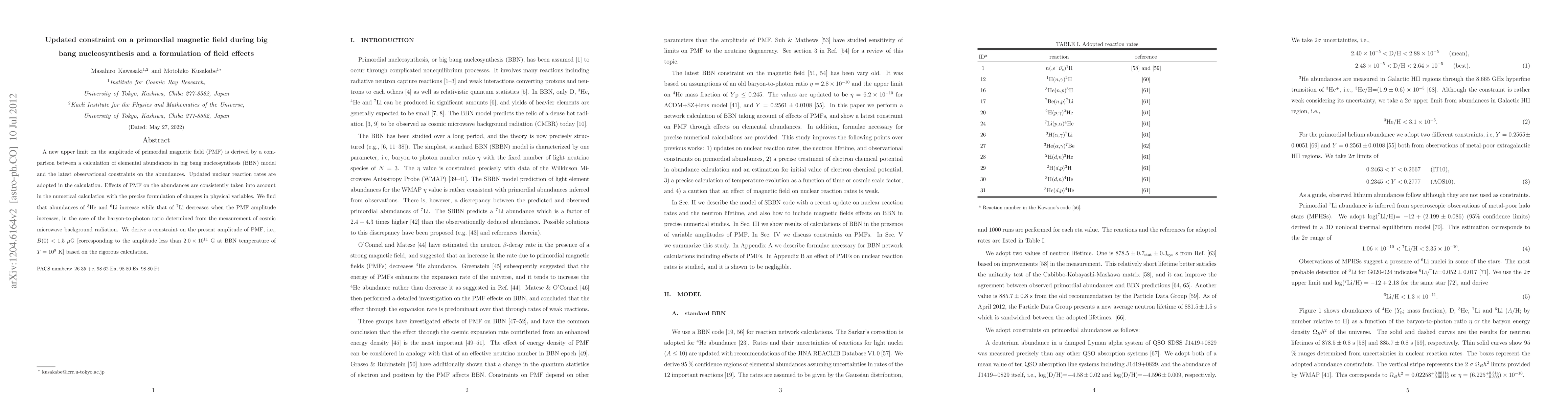 A new upper limit on the amplitude of primordial magnetic field (PMF) is derived by a comparison between a calculation of elemental abundances in big bang nucleosynthesis (BBN) model and the latest observational constraints on the abundances. Updated nuclear reaction rates are adopted in the calculation. Effects of PMF on the abundances are consistently taken into account in the numerical calculation with the precise formulation of changes in physical variables. We find that abundances of 3He and 6Li increase while that of 7Li decreases when the PMF amplitude increases, in the case of the baryon-to-photon ratio determined from the measurement of cosmic microwave background radiation. We derive a constraint on the present amplitude of PMF, i.e., B(0)<1.5 micro G [corresponding to the amplitude less than 2.0x10^{11} G at BBN temperature of T=10^9 K] based on the rigorous calculation.