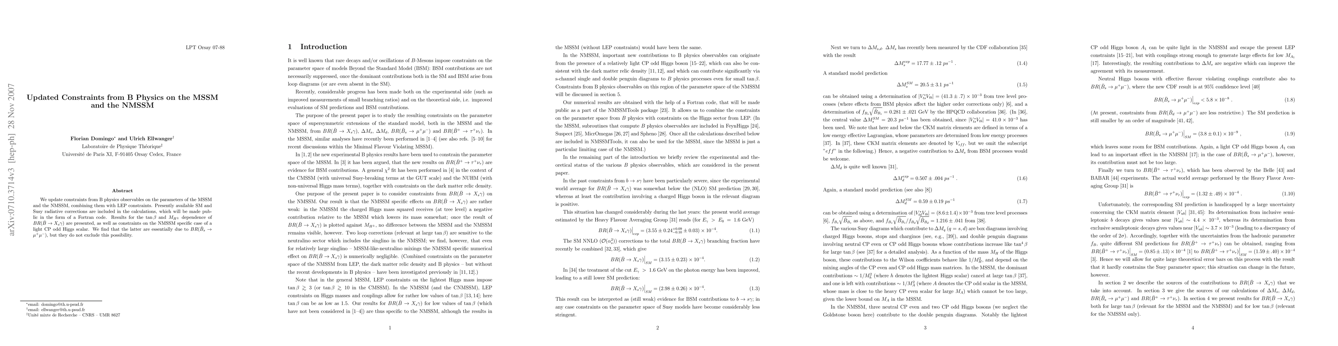 This paper updates constraints from B physics on the MSSM and NMSSM, integrating LEP results and SM/Susy radiative corrections. It presents findings on the tan(beta) and M_{H^+} dependence of b -> s gamma and highlights constraints on a light CP odd Higgs in the NMSSM, primarily driven by B_s -> mu^+ mu^-.