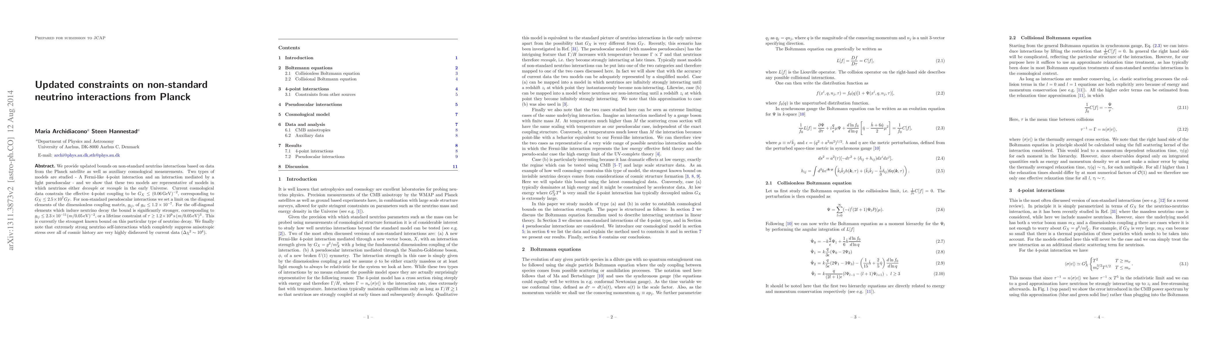 This paper updates constraints on non-standard neutrino interactions using Planck satellite data and auxiliary cosmological measurements, finding $G_X \leq 2.5 \times 10^7 G_F$ for Fermi-like 4-point interactions and $g_{ii} \leq 1.2 \times 10^{-7}$ for pseudoscalar interactions. The strongest bound is on neutrino decay, with $g_{ij} \leq 2.3 \times 10^{-11}(m/0.05 \, {\rm eV})^{-2}$.