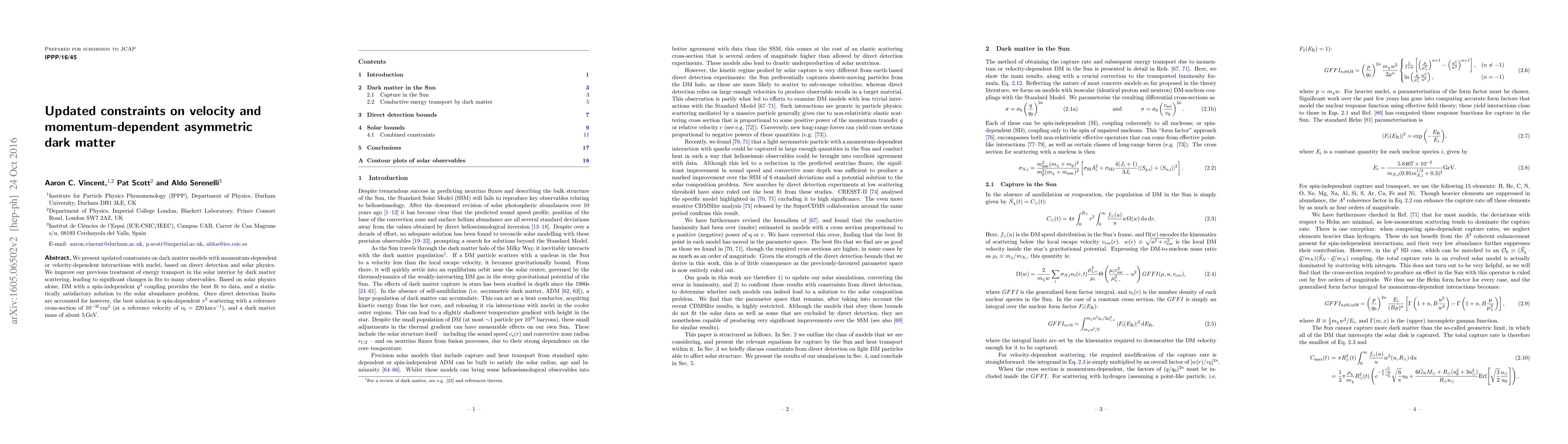 This paper updates constraints on dark matter models featuring momentum-dependent or velocity-dependent interactions, using direct detection and solar physics data. The best fit to solar data suggests spin-independent $q^{4}$ coupling, but direct detection limits favor spin-dependent $v^2$ scattering with a cross-section of $10^{-35}$ cm$^2$ and a dark matter mass of around 5 GeV.