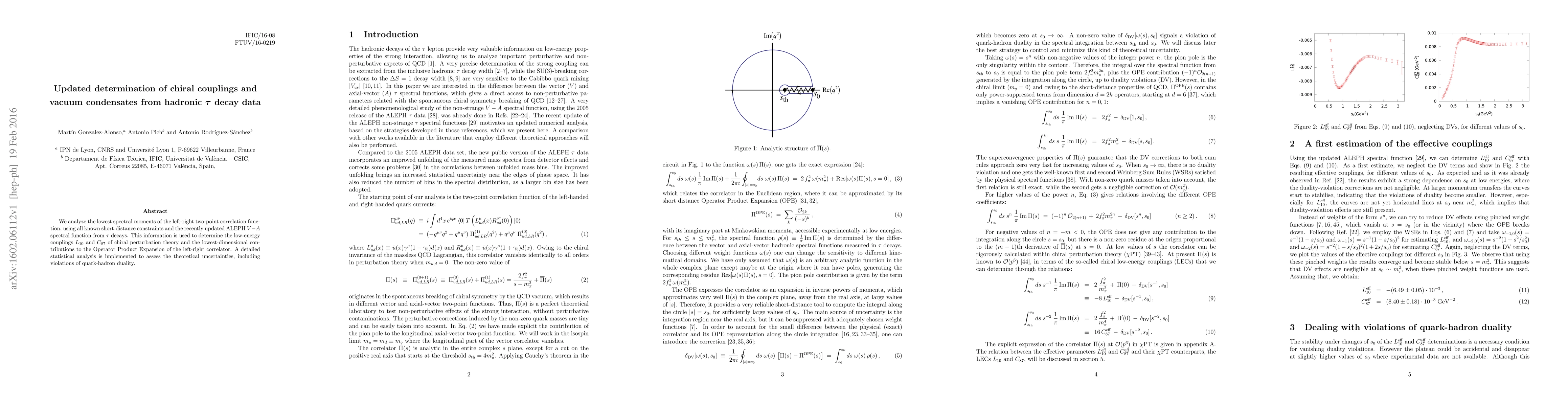 We analyze the lowest spectral moments of the left-right two-point correlation function, using all known short-distance constraints and the recently updated ALEPH V-A spectral function from tau decays. This information is used to determine the low-energy couplings L10 and C87 of chiral perturbation theory and the lowest-dimensional contributions to the Operator Product Expansion of the left-right correlator. A detailed statistical analysis is implemented to assess the theoretical uncertainties, including violations of quark-hadron duality.