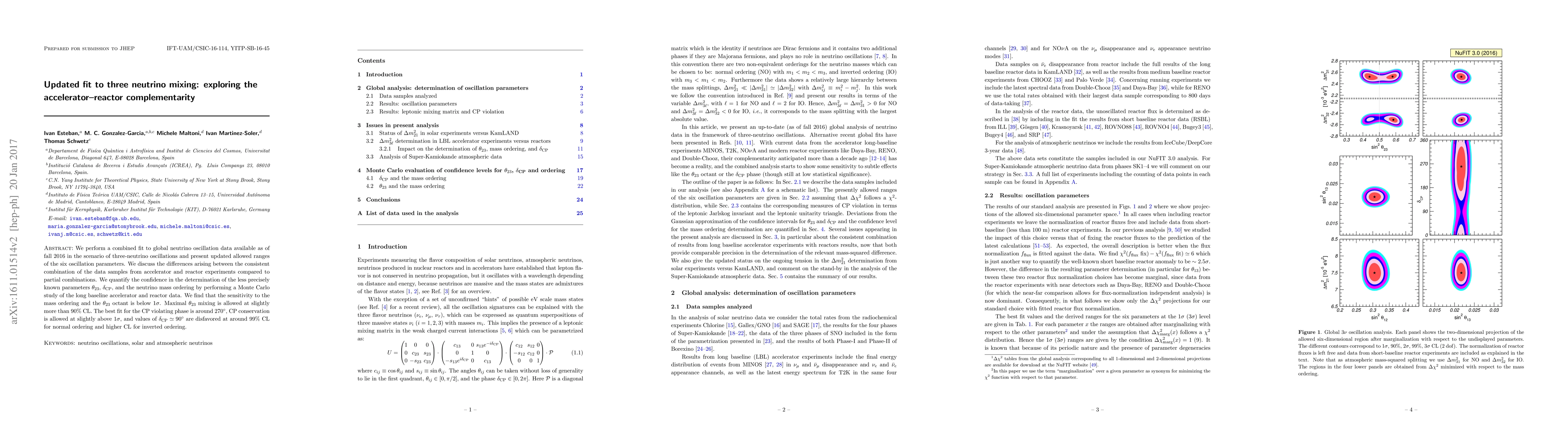 This paper updates the fit for three-neutrino mixing parameters using global oscillation data from 2016, highlighting the complementary roles of accelerator and reactor experiments. It finds that while accelerator and reactor data together improve parameter precision, individual data sets show less confidence in determining $\theta_{23}$, $\delta_{CP}$, and mass ordering.