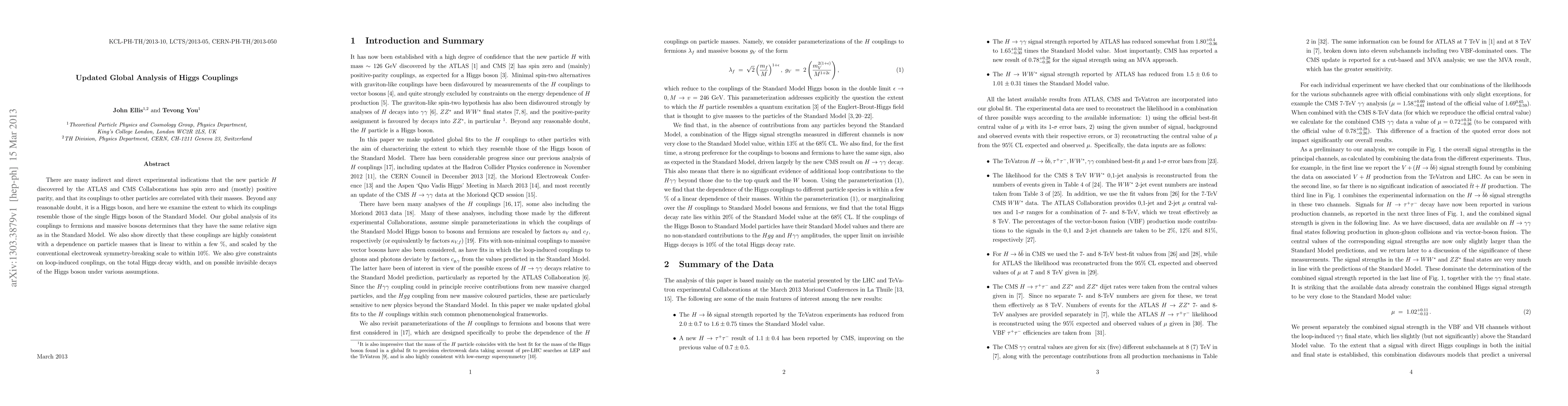 There are many indirect and direct experimental indications that the new particle H discovered by the ATLAS and CMS Collaborations has spin zero and (mostly) positive parity, and that its couplings to other particles are correlated with their masses. Beyond any reasonable doubt, it is a Higgs boson, and here we examine the extent to which its couplings resemble those of the single Higgs boson of the Standard Model. Our global analysis of its couplings to fermions and massive bosons determines that they have the same relative sign as in the Standard Model. We also show directly that these couplings are highly consistent with a dependence on particle masses that is linear to within a few %, and scaled by the conventional electroweak symmetry-breaking scale to within 10%. We also give constraints on loop-induced couplings, on the total Higgs decay width, and on possible invisible decays of the Higgs boson under various assumptions.