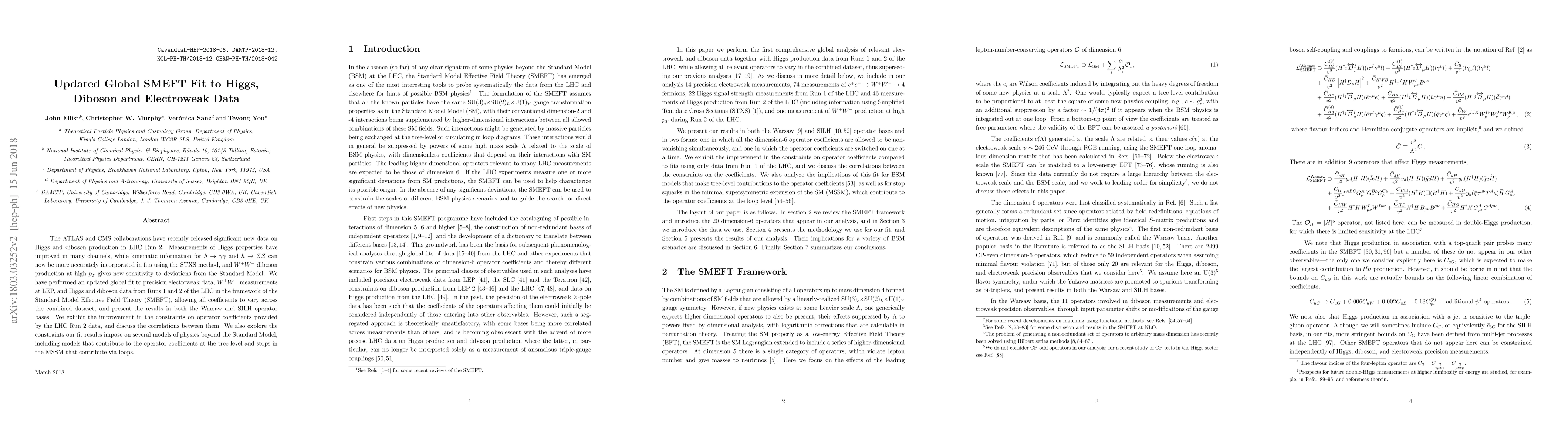 The ATLAS and CMS collaborations have recently released significant new data on Higgs and diboson production in LHC Run 2. Measurements of Higgs properties have improved in many channels, while kinematic information for $h \to \gamma\gamma$ and $h \to ZZ$ can now be more accurately incorporated in fits using the STXS method, and $W^+ W^-$ diboson production at high $p_T$ gives new sensitivity to deviations from the Standard Model. We have performed an updated global fit to precision electroweak data, $W^+W^-$ measurements at LEP, and Higgs and diboson data from Runs 1 and 2 of the LHC in the framework of the Standard Model Effective Field Theory (SMEFT), allowing all coefficients to vary across the combined dataset, and present the results in both the Warsaw and SILH operator bases. We exhibit the improvement in the constraints on operator coefficients provided by the LHC Run 2 data, and discuss the correlations between them. We also explore the constraints our fit results impose on several models of physics beyond the Standard Model, including models that contribute to the operator coefficients at the tree level and stops in the MSSM that contribute via loops.