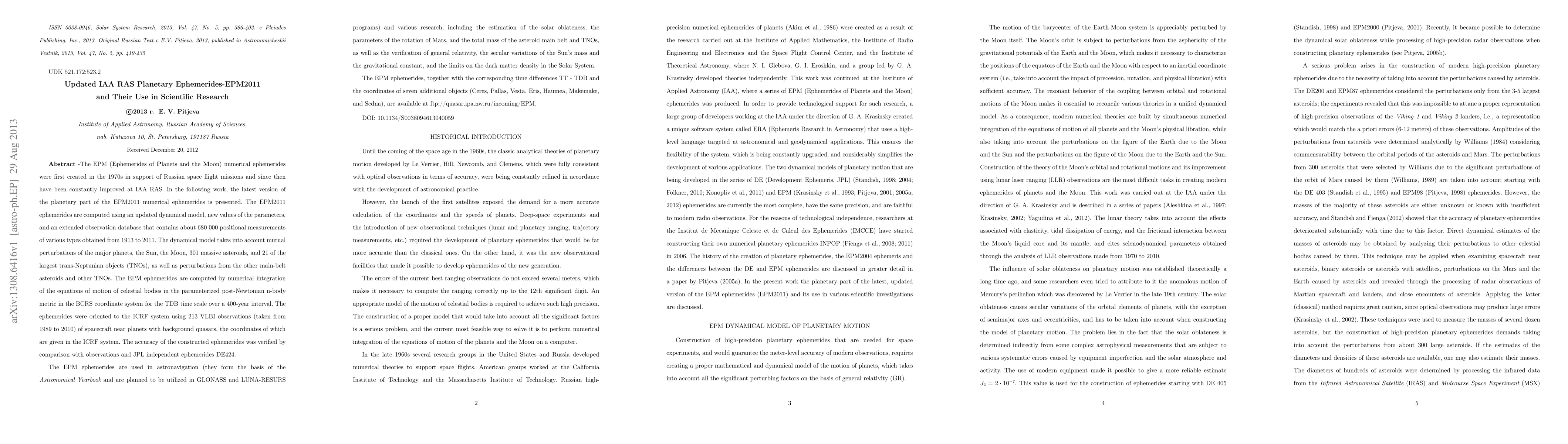 New planetary ephemerides (EPM2011) provide more accurate predictions for celestial bodies, enabling research on solar oblateness, Mars rotation, asteroid masses, and dark matter density in the Solar System.