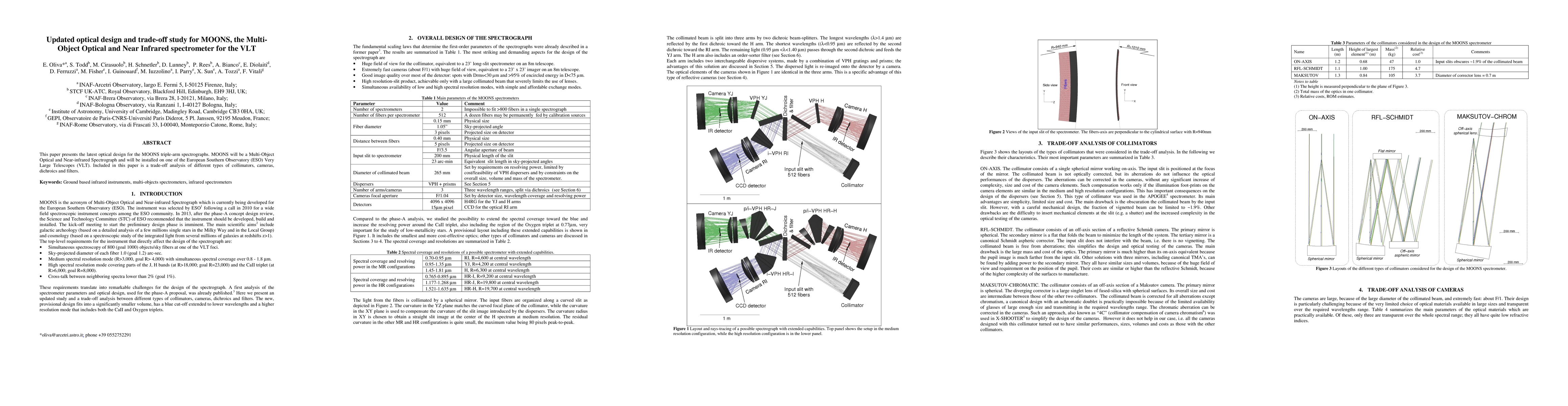 This paper updates the optical design of MOONS, a Multi-Object Optical and Near-infrared Spectrograph for the VLT, and conducts a trade-off analysis of various components including collimators, cameras, dichroics, and filters to optimize the instrument's performance.