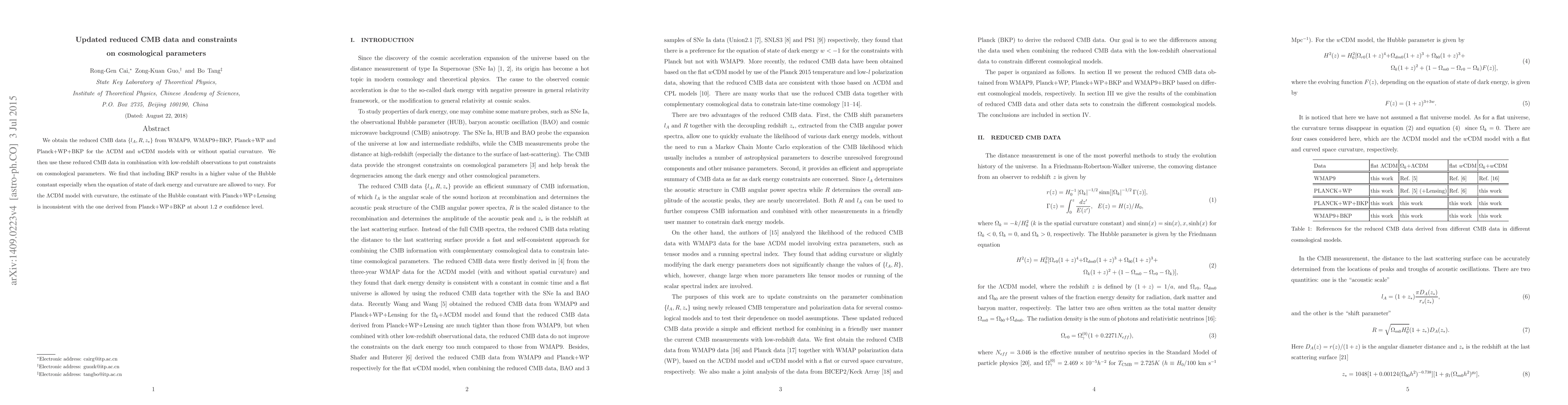 We obtain the reduced CMB data $\{l_A, R, z_*\}$ from WMAP9, WMAP9+BICEP2, Planck+WP and Planck+WP+BICEP2 for the $\Lambda$CDM and $w$CDM models with or without spatial curvature. We then use these reduced CMB data in combination with low-redshift observations to put constraints on cosmological parameters. We find that including BICEP2 results in a higher value of the Hubble constant especially when the equation of state of dark energy and curvature are allowed to vary. For the $\Lambda$CDM model with curvature, the estimate of the Hubble constant with Planck+WP+Lensing is inconsistent with the one derived from Planck+WP+BICEP at about 1.3 $\sigma$ confidence level.