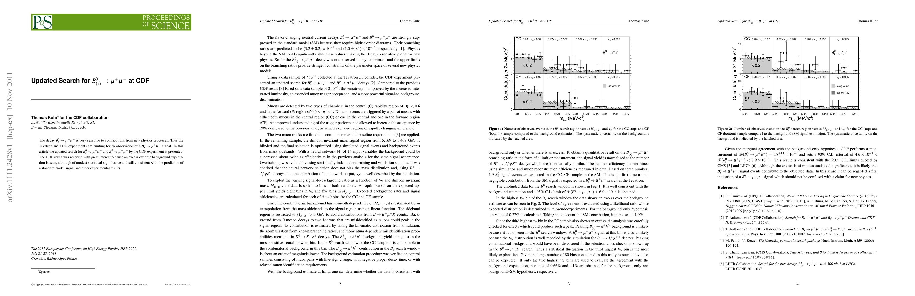The CDF experiment reports an updated search for the rare decays Bs -> mu+mu- and B0 -> mu+mu-, finding an excess over background expectations that hints at potential new physics, though the result remains consistent with standard model predictions and lacks high statistical significance.