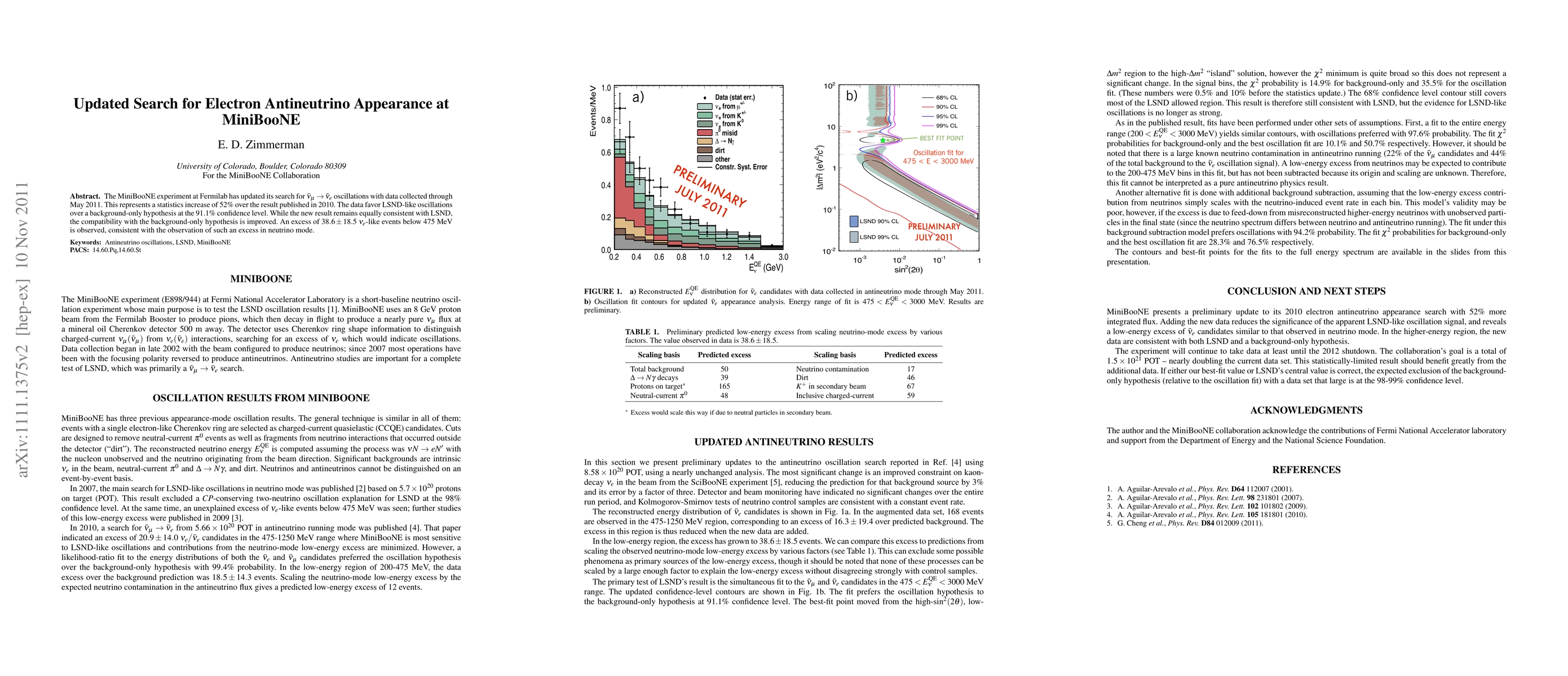 Researchers at Fermilab have found evidence of electron antineutrino appearance in data collected up to 2011, favoring a background-only hypothesis at a 91.1% confidence level.