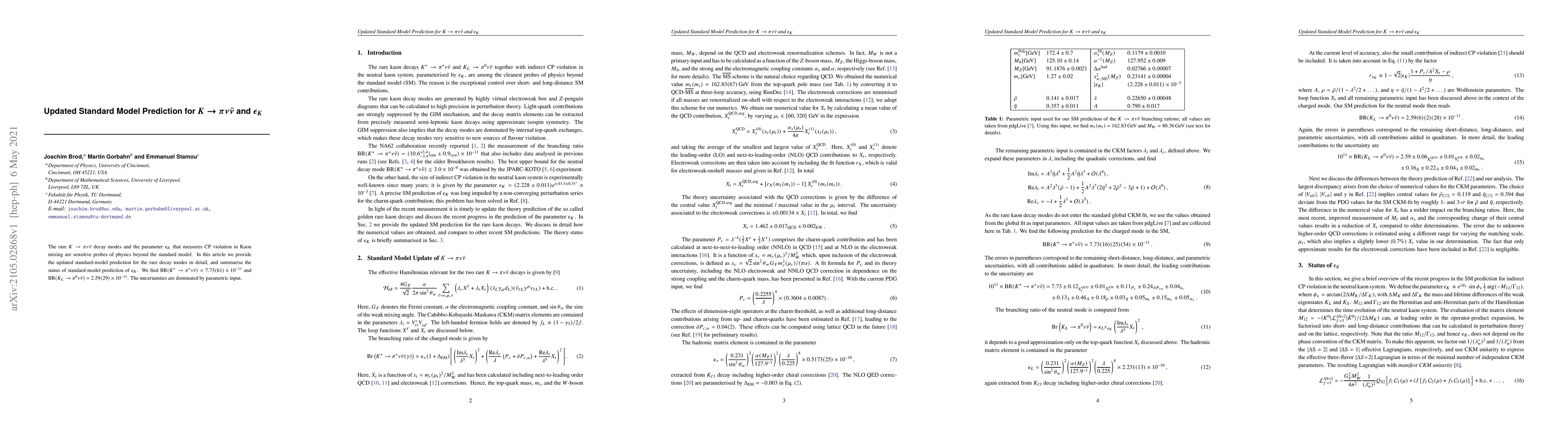The rare $K \to \pi \nu \bar{\nu}$ decay modes and the parameter $\epsilon_K$ that measures CP violation in Kaon mixing are sensitive probes of physics beyond the standard model. In this article we provide the updated standard-model prediction for the rare decay modes in detail, and summarise the status of standard-model prediction of $\epsilon_K$. We find $\text{BR}(K^+ \to \pi^+ \nu \bar \nu) = 7.73(61) \times 10^{-11}$ and $\text{BR}(K_L \to \pi^0 \nu \bar \nu) = 2.59(29) \times 10^{-11}$. The uncertainties are dominated by parametric input.