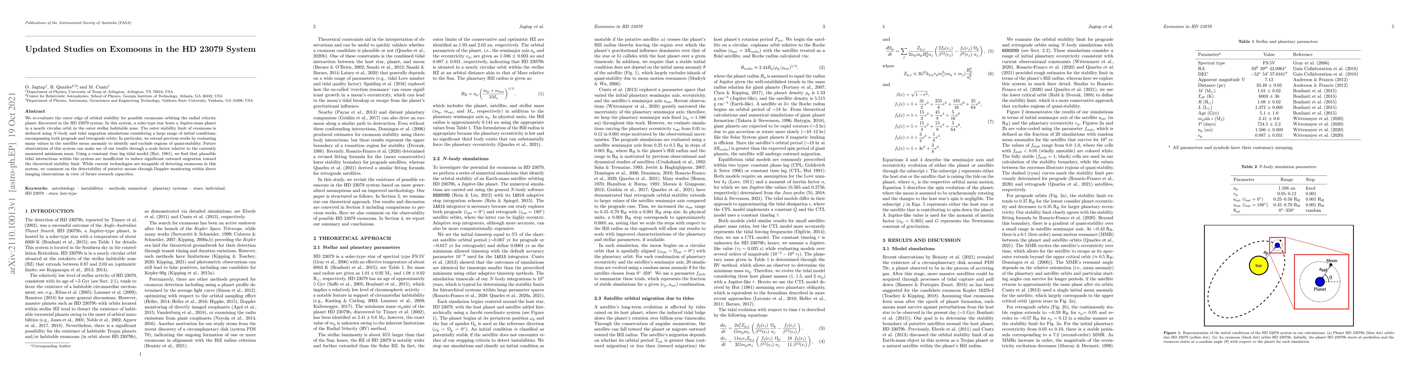 We re-evaluate the outer edge of orbital stability for possible exomoons orbiting the radial velocity planet discovered in the HD 23079 system. In this system, a solar-type star hosts a Jupiter-mass planet in a nearly circular orbit in the outer stellar habitable zone. The outer stability limit of exomoons is deduced using $N$-body and tidal migration simulations considering a large range of initial conditions, encompassing both prograde and retrograde orbits. In particular, we extend previous works by evaluating many values in the satellite mean anomaly to identify and exclude regions of quasi-stability. Future observations of this system can make use of our results through a scale factor relative to the currently measured minimum mass. Using a constant time lag tidal model (Hut 1981), we find that plausible tidal interactions within the system are insufficient to induce significant outward migration toward the theoretical stability limit. While current technologies are incapable of detecting exomoons in this system, we comment on the detectability of putative moons through Doppler monitoring within direct imaging observations in view of future research capacities.