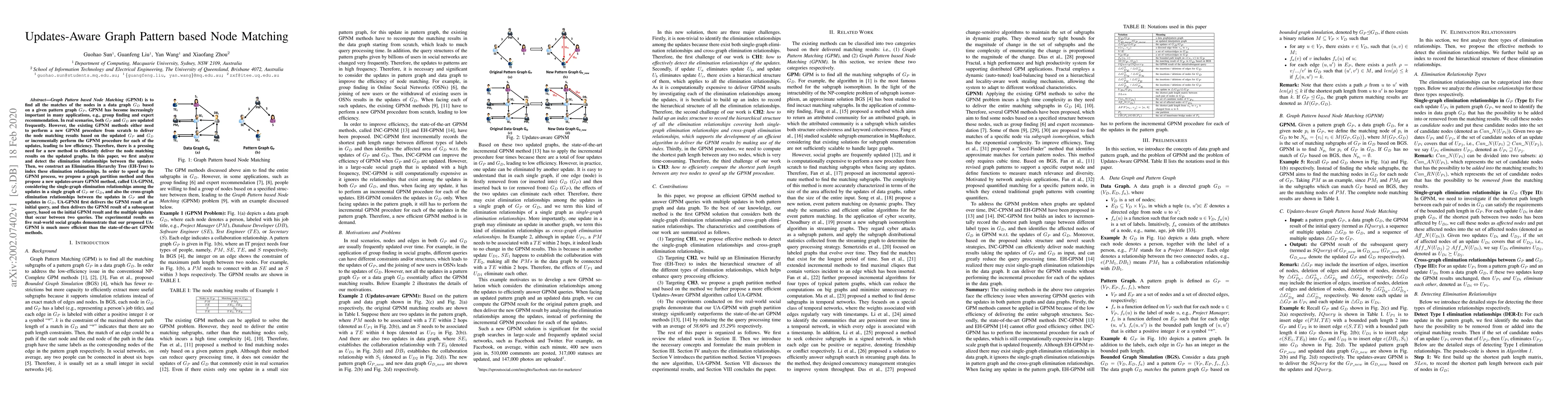 Graph Pattern based Node Matching (GPNM) is to find all the matches of the nodes in a data graph GD based on a given pattern graph GP. GPNM has become increasingly important in many applications, e.g., group finding and expert recommendation. In real scenarios, both GP and GD are updated frequently. However, the existing GPNM methods either need to perform a new GPNM procedure from scratch to deliver the node matching results based on the updated GP and GD or incrementally perform the GPNM procedure for each of the updates, leading to low efficiency. Therefore, there is a pressing need for a new method to efficiently deliver the node matching results on the updated graphs. In this paper, we first analyze and detect the elimination relationships between the updates. Then, we construct an Elimination Hierarchy Tree (EH-Tree) to index these elimination relationships. In order to speed up the GPNM process, we propose a graph partition method and then propose a new updates-aware GPNM method, called UA-GPNM, considering the single-graph elimination relationships among the updates in a single graph of GP or GD, and also the cross-graph elimination relationships between the updates in GP and the updates in GD. UA-GPNM first delivers the GPNM result of an initial query, and then delivers the GPNM result of a subsequent query, based on the initial GPNM result and the multiple updates that occur between two queries. The experimental results on five real-world social graphs demonstrate that our proposed UA-GPNM is much more efficient than the state-of-the-art GPNM methods.