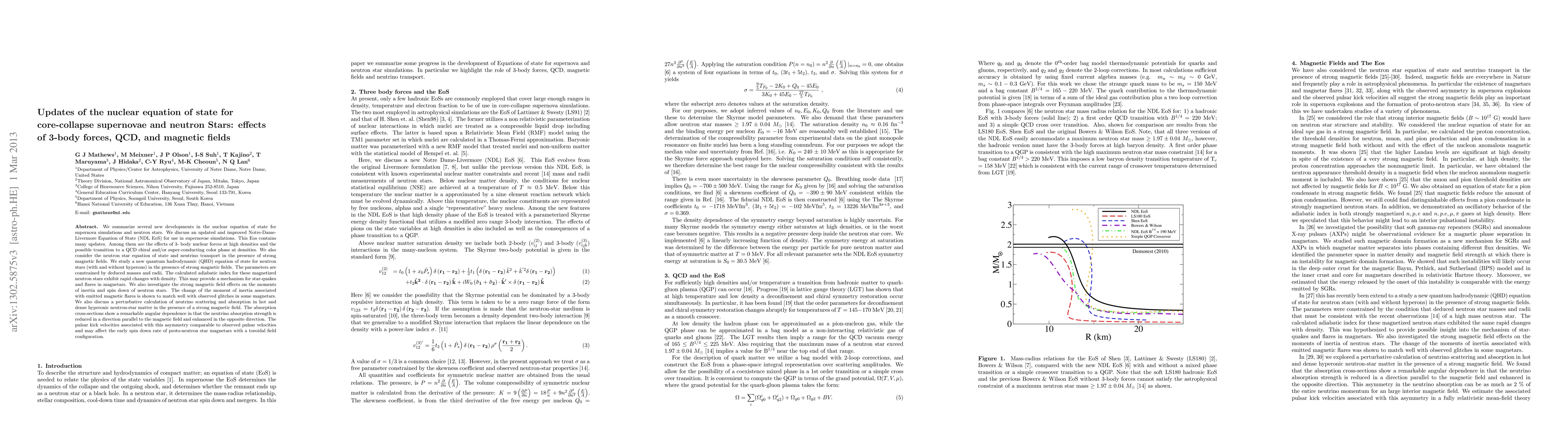 This paper updates the nuclear equation of state (EoS) for core-collapse supernovae and neutron stars, incorporating 3-body forces, QCD phases, and magnetic fields. It introduces an improved NDL EoS with high-density effects and explores neutron star dynamics under strong magnetic fields, including magnetic field impacts on moments of inertia and neutrino transport.