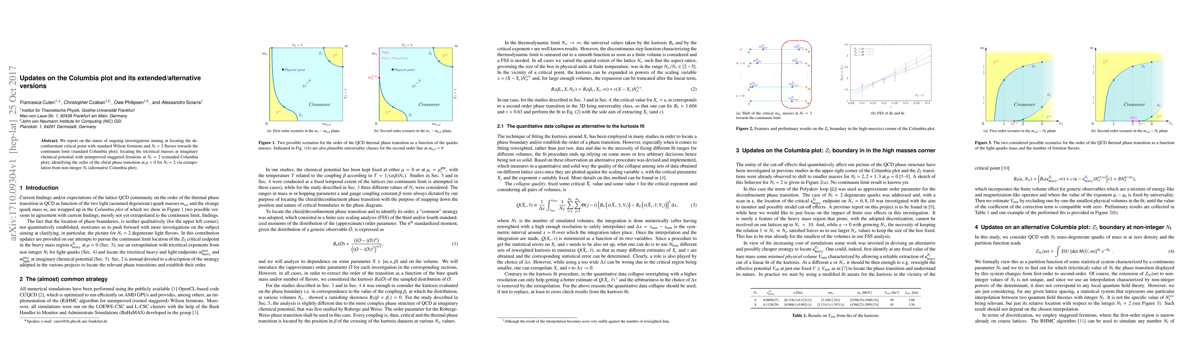 We report on the status of ongoing investigations aiming at locating the deconfinement critical point with standard Wilson fermions and $N_f=2$ flavors towards the continuum limit (standard Columbia plot); locating the tricritical masses at imaginary chemical potential with unimproved staggered fermions at $N_f=2$ (extended Columbia plot); identifying the order of the chiral phase transition at $\mu=0$ for $N_f=2$ via extrapolation from non integer $N_f$ (alternative Columbia plot).