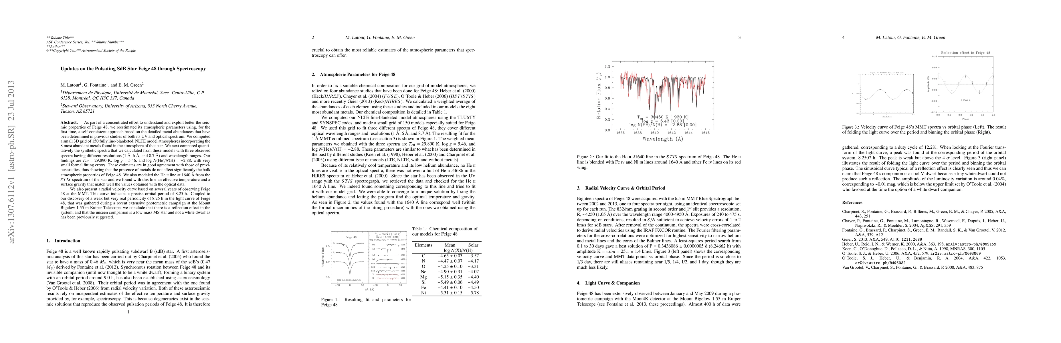 As part of a concentrated effort to understand and exploit better the seismic properties of Feige 48, we reestimated its atmospheric parameters using, for the first time, a self-consistent approach based on the detailed metal abundances that have been determined in previous studies of both its UV and optical spectrum. We computed a small 3D grid of 150 fully line-blanketed, NLTE model atmospheres incorporating the 8 most abundant metals found in the atmosphere of that star. We next compared quantitatively the synthetic spectra that we calculated from these models with three observed spectra having different resolutions (1 A, 6 A, and 8.7 A) and wavelength ranges. Our findings are Teff = 29,890 K, log g = 5.46, and log N(He)/N(H) = -2.88, with very small formal fitting errors. These estimates are in good agreement with those of previous studies, thus showing that the presence of metals do not affect significantly the bulk atmospheric properties of Feige 48. We also modeled the He II line at 1640 A from the STIS spectrum of the star and we found with this line an effective temperature and a surface gravity that match well the values obtained with the optical data. We also present a radial velocity curve based on several years of observing Feige 48 at the MMT. This curve indicates a precise orbital period of 8.25 h. Coupled to our discovery of a weak but very real periodicity of 8.25 h in the light curve of Feige 48, that was gathered during a recent extensive photometric campaign at the Mount Bigelow 1.55 m Kuiper Telescope, we conclude that there is a reflection effect in the system, and that the unseen companion is a low mass MS star and not a white dwarf as has been previously suggested.
