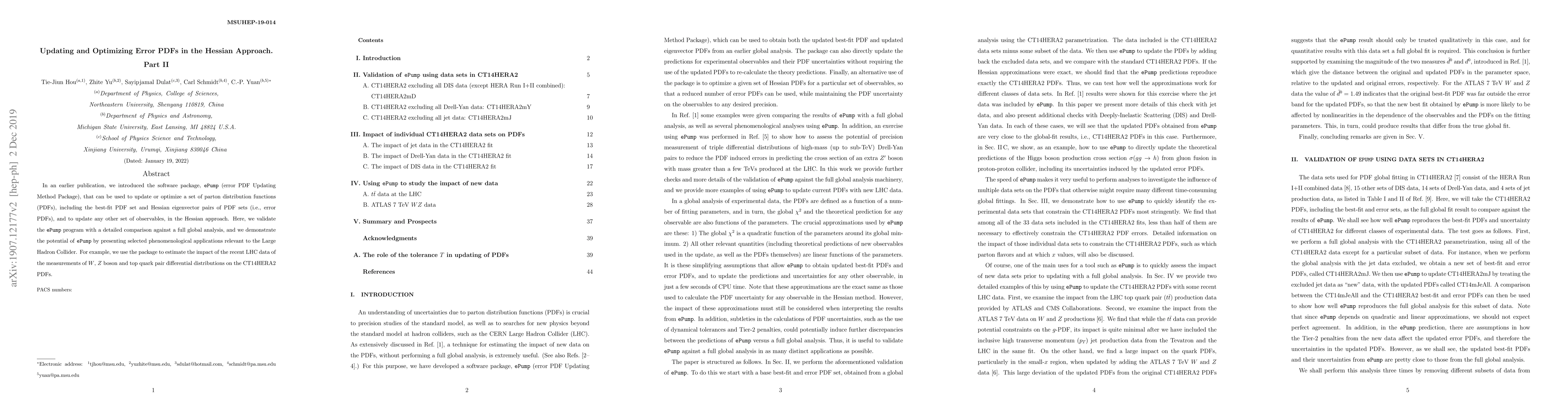 In an earlier publication, we introduced the software package, {\tt \texttt{ePump}} (error PDF Updating Method Package), that can be used to update or optimize a set of parton distribution functions (PDFs), including the best-fit PDF set and Hessian eigenvector pairs of PDF sets (i.e., error PDFs), and to update any other set of observables, in the Hessian approach. Here, we validate the {\tt \texttt{ePump}} program with a detailed comparison against a full global analysis, and we demonstrate the potential of {\tt \texttt{ePump}} by presenting selected phenomenological applications relevant to the Large Hadron Collider. For example, we use the package to estimate the impact of the recent LHC data of the measurements of $W$, $Z$ boson and top quark pair differential distributions on the CT14HERA2 PDFs.
