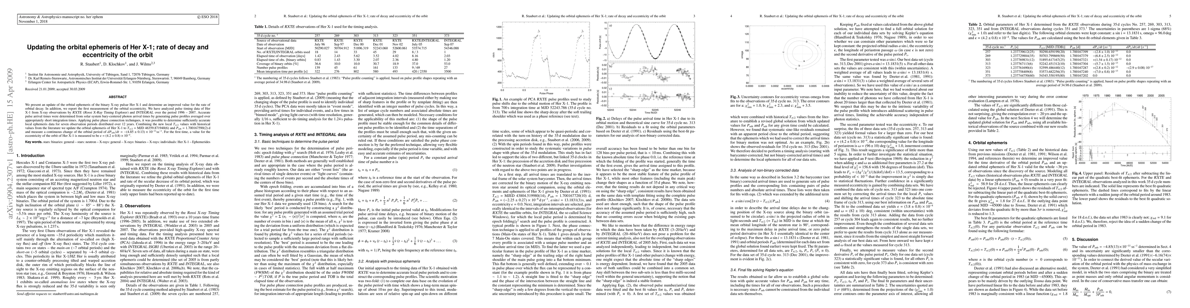 This paper updates the orbital ephemeris of the binary X-ray pulsar Her X-1, determining an improved rate of orbital decay and measuring the first orbital eccentricity. Analysis of X-ray data from RXTE and INTEGRAL over 12 years yields an updated orbital period and a continuous decay rate of dPorb/dt = -(4.85 +/- 0.13) x 10-11 s/s, along with an orbital eccentricity of e = (4.2 +/- 0.8) x 10-4.