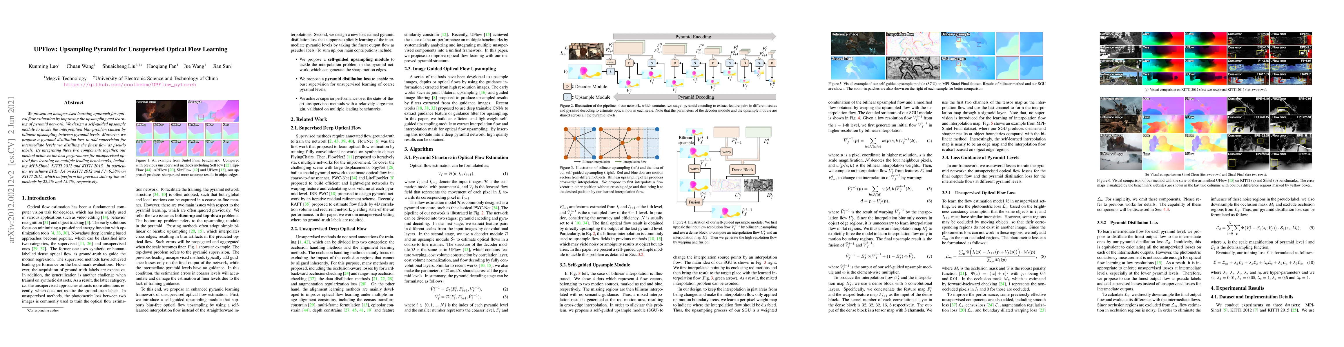 UPFlow introduces an unsupervised learning method for optical flow estimation using an improved upsampling pyramid network. It employs a self-guided upsample module to mitigate interpolation blur and a pyramid distillation loss for intermediate supervision, achieving superior performance on benchmarks like MPI-SIntel, KITTI 2012, and KITTI 2015.