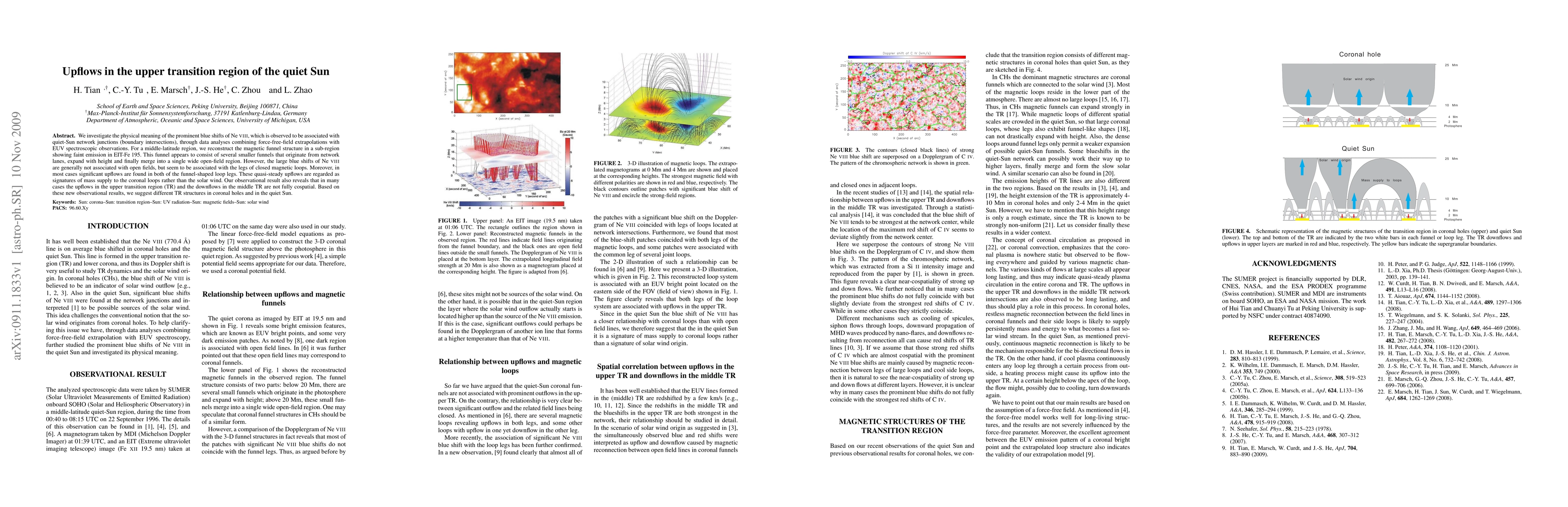 This study reveals that blue shifts in Ne VIII at quiet-Sun network junctions are linked to upflows in closed magnetic loop legs rather than open fields. The observed upflows suggest mass supply to coronal loops, indicating distinct transition region structures between coronal holes and the quiet Sun.