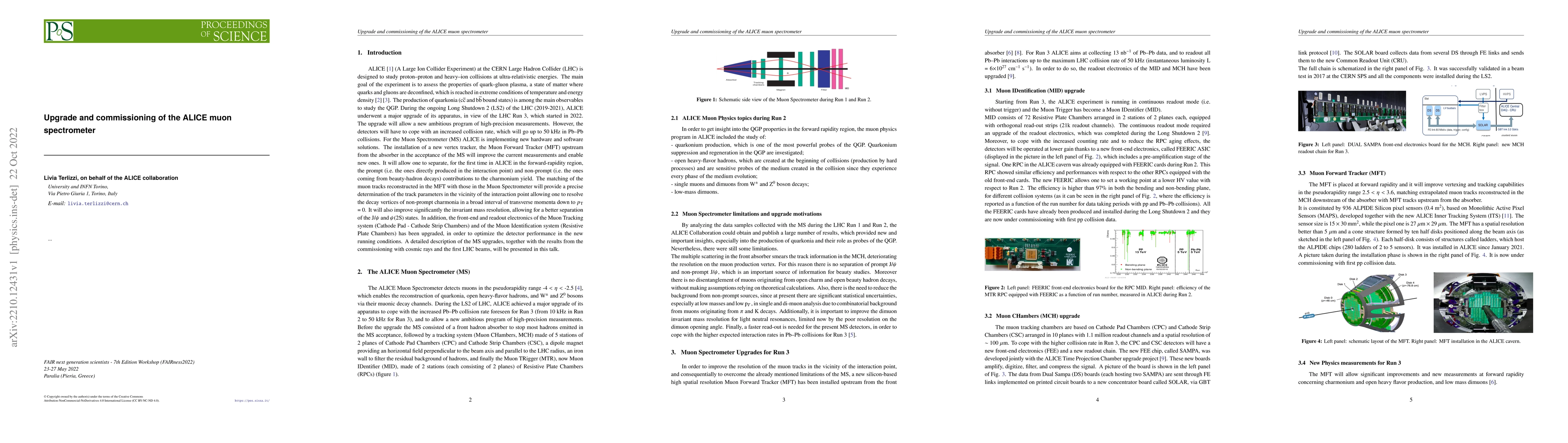 The ALICE muon spectrometer is undergoing significant upgrades to enhance its performance for LHC Run 3, including the installation of a new vertex tracker and improvements in front-end electronics. Commissioning results with cosmic rays and initial LHC beams demonstrate the effectiveness of these upgrades.