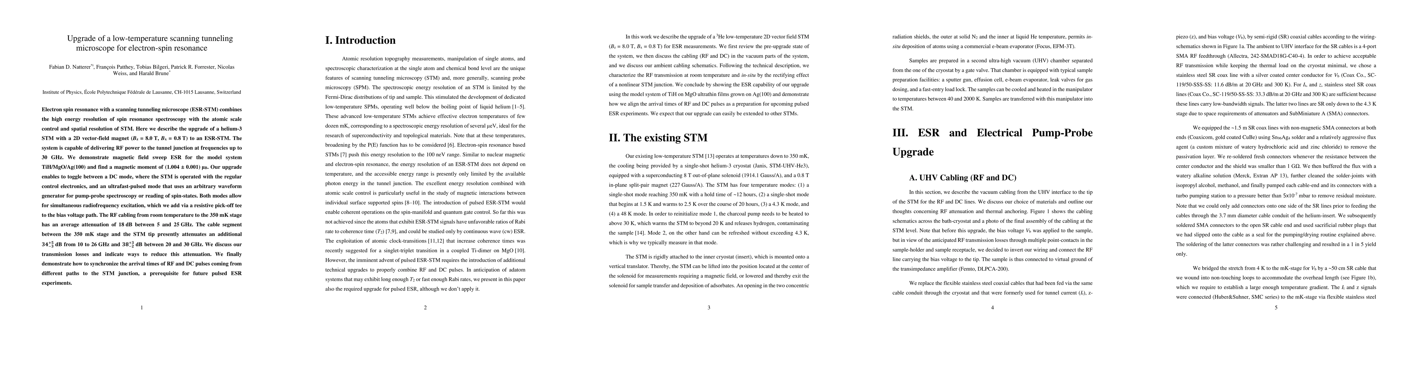 Electron spin resonance with a scanning tunneling microscope (ESR-STM) combines the high energy resolution of spin resonance spectroscopy with the atomic scale control and spatial resolution of STM. Here we describe the upgrade of a helium-3 STM with a 2D vector-field magnet ($B_z$ = 8.0 T, $B_x$ = 0.8 T) to an ESR-STM. The system is capable of delivering RF power to the tunnel junction at frequencies up to 30 GHz. We demonstrate magnetic field sweep ESR for the model system TiH/MgO/Ag(100) and find a magnetic moment of $(1.004 \pm 0.001)$ $\mu_B$. Our upgrade enables to toggle between a DC mode, where the STM is operated with the regular control electronics, and an ultrafast-pulsed mode that uses an arbitrary waveform generator for pump-probe spectroscopy or reading of spin-states. Both modes allow for simultaneous radiofrequency excitation, which we add via a resistive pick-off tee to the bias voltage path. The RF cabling from room temperature to the 350 mK stage has an average attenuation of 18 dB between 5 and 25 GHz. The cable segment between the 350 mK stage and the STM tip presently attenuates an additional $34_{-3}^{+5}$ dB from 10 to 26 GHz and $38_{-2}^{+3}$ dB between 20 and 30 GHz. We discuss our transmission losses and indicate ways to reduce this attenuation. We finally demonstrate how to synchronize the arrival times of RF and DC pulses coming from different paths to the STM junction, a prerequisite for future pulsed ESR experiments.