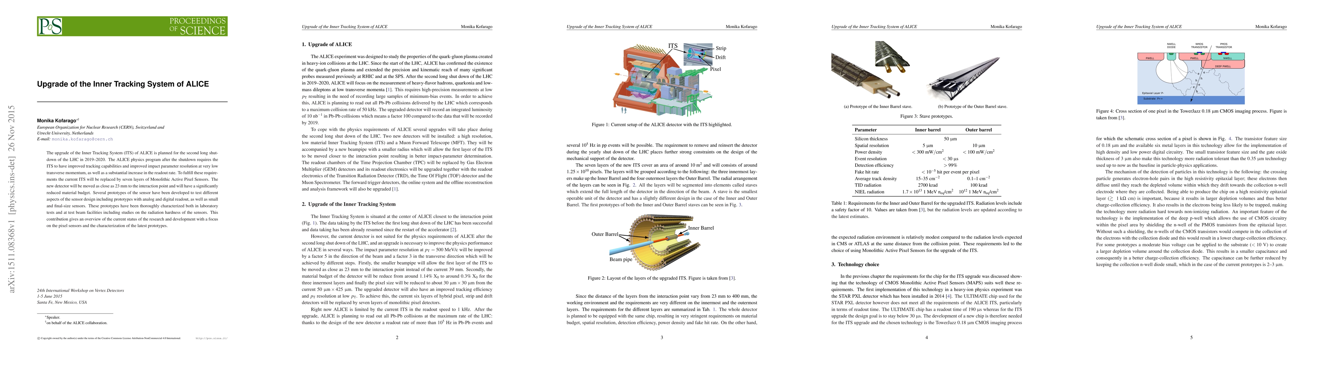 The ALICE experiment is upgrading its Inner Tracking System (ITS) to enhance tracking capabilities and reduce material budget, replacing the current system with seven layers of Monolithic Active Pixel Sensors. Prototypes of these sensors have been tested for their performance and radiation hardness to meet the new requirements.