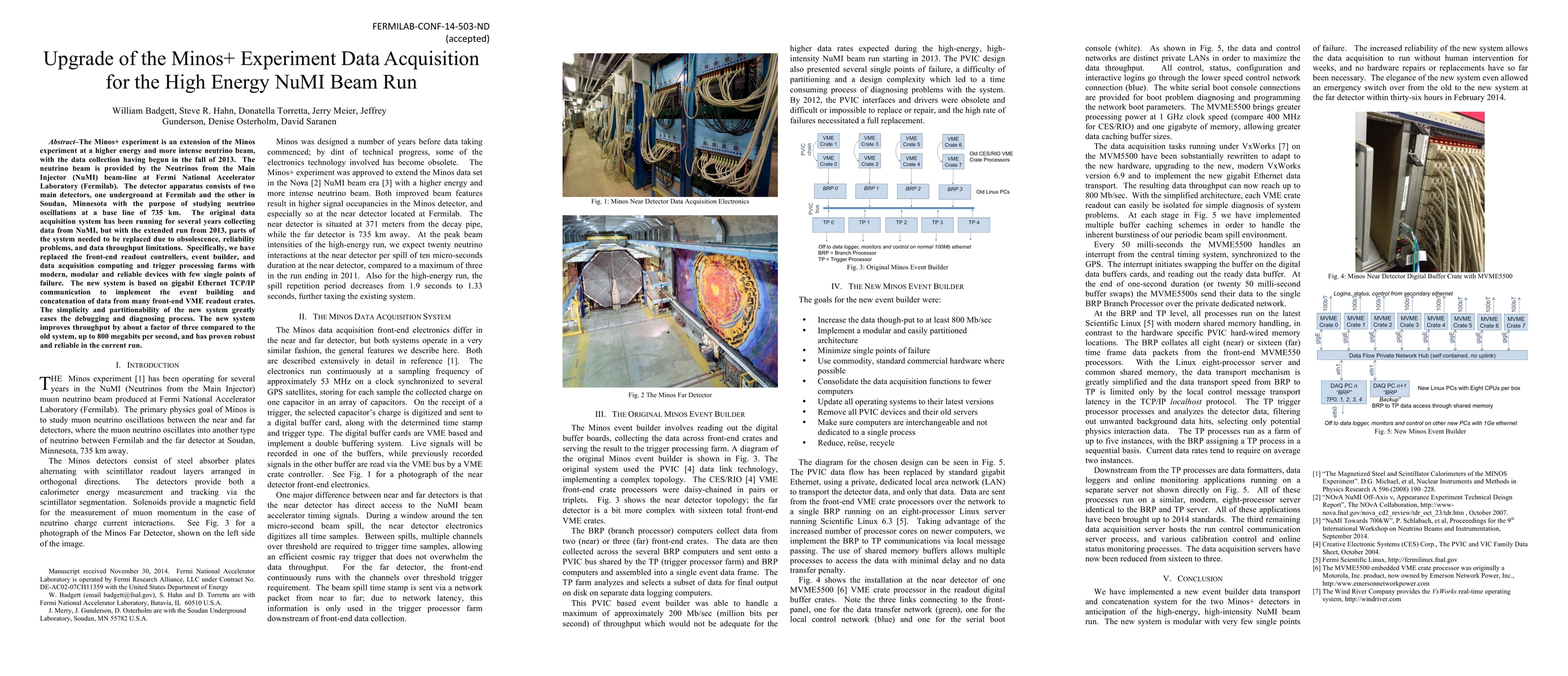 The Minos+ experiment upgraded its data acquisition system to handle the high-energy NuMI beam run, replacing outdated components with modern, modular devices to enhance reliability and data throughput, achieving a threefold improvement to 800 megabits per second. The new system's TCP/IP communication and simplified architecture facilitate easier debugging and maintenance.