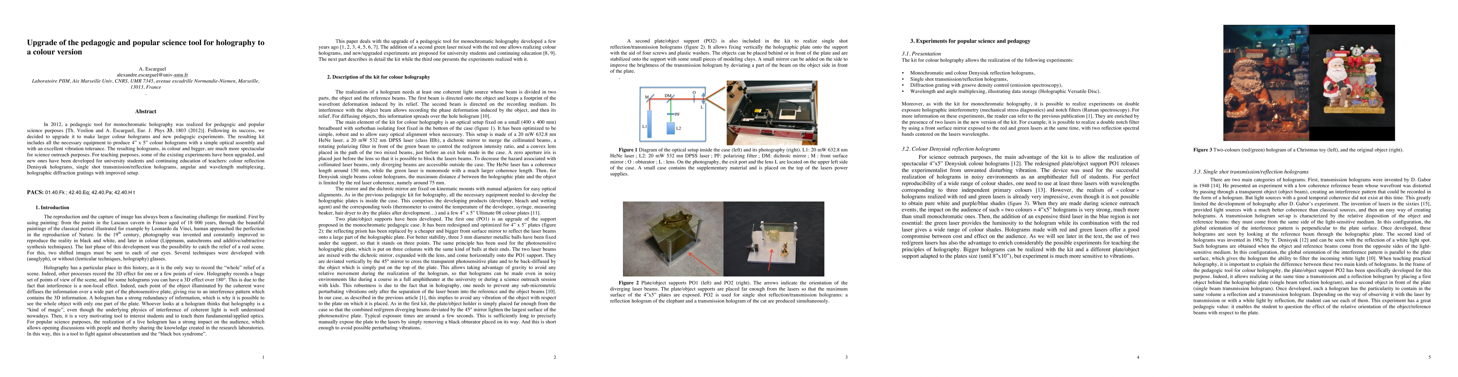 In 2012, a pedagogic tool for monochromatic holography was realized for pedagogic and popular science purposes [Th. Voslion and A. Escarguel, Eur. J. Phys 33, 1803 (2012)]. Following its success, we decided to upgrade it to make larger colour holograms and new pedagogic experiments. The resulting kit includes all the necessary equipment to produce 4 "x 5" colour holograms with a simple optical assembly and with an excellent vibration tolerance. The resulting holograms, in colour and bigger, are much more spectacular for science outreach purposes. For teaching purposes, some of the existing experiments have been upgraded, and new ones have been developed for university students and continuing education of teachers: colour reflection Denisyuk holograms, single shot transmission/reflection holograms, angular and wavelength multiplexing, holographic diffraction gratings with improved setup.