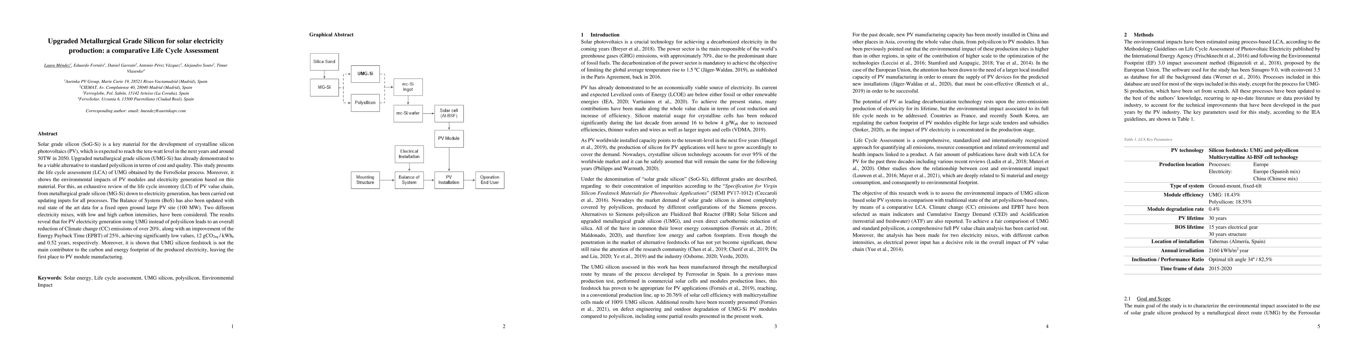 This study compares the life cycle assessment of Upgraded Metallurgical Grade Silicon (UMG-Si) versus standard polysilicon for solar electricity production. The results show UMG-Si leads to a 20% reduction in climate change emissions and a 25% improvement in energy payback time, achieving 12 gCO2eq/kWhe and 0.52 years respectively, with UMG-Si not being the main contributor to the carbon footprint, unlike PV module manufacturing.