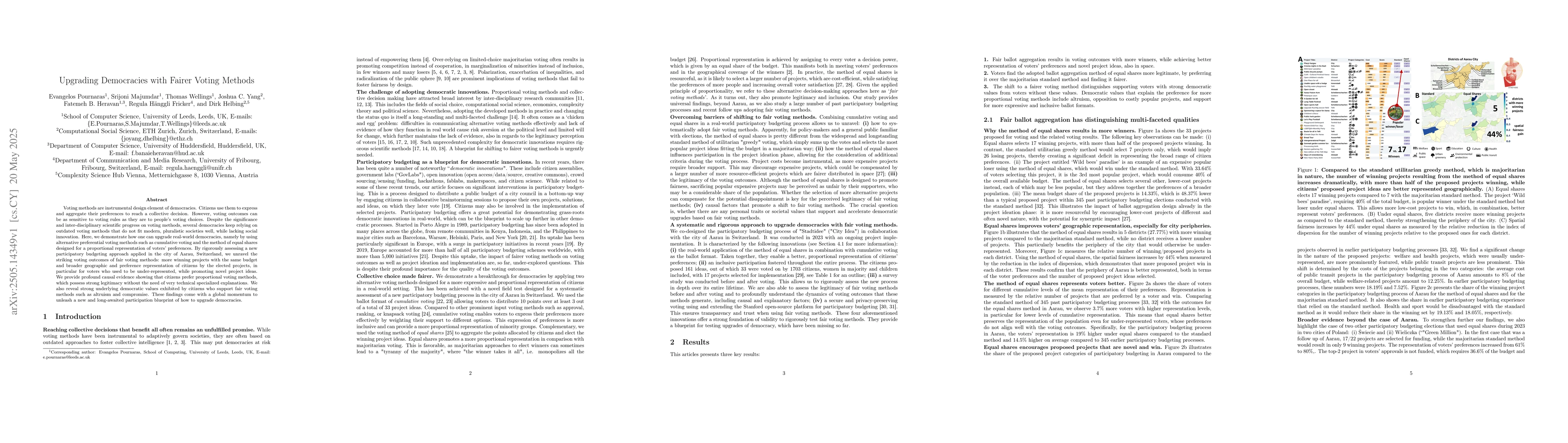 This paper demonstrates how fair voting methods like cumulative voting and proportional representation can improve democracy by giving more voice to underrepresented citizens and promoting novel project ideas.