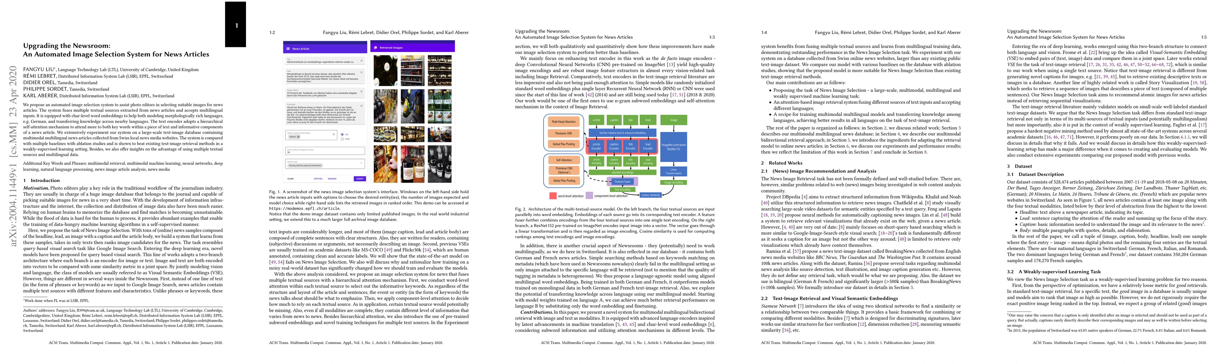 We propose an automated image selection system to assist photo editors in selecting suitable images for news articles. The system fuses multiple textual sources extracted from news articles and accepts multilingual inputs. It is equipped with char-level word embeddings to help both modeling morphologically rich languages, e.g. German, and transferring knowledge across nearby languages. The text encoder adopts a hierarchical self-attention mechanism to attend more to both keywords within a piece of text and informative components of a news article. We extensively experiment with our system on a large-scale text-image database containing multimodal multilingual news articles collected from Swiss local news media websites. The system is compared with multiple baselines with ablation studies and is shown to beat existing text-image retrieval methods in a weakly-supervised learning setting. Besides, we also offer insights on the advantage of using multiple textual sources and multilingual data.