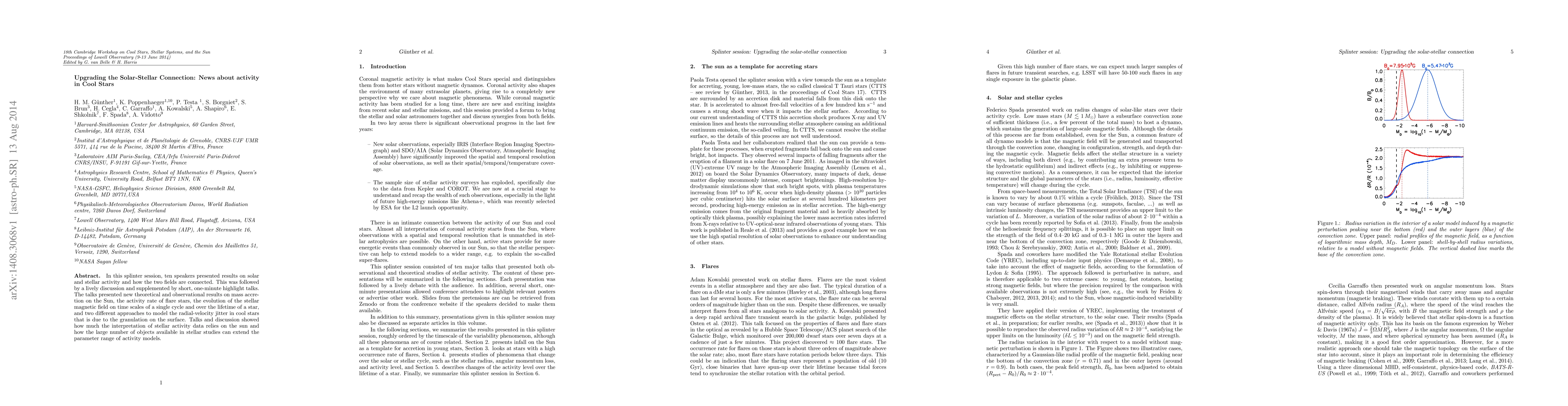 This paper summarizes a session where researchers presented new findings on solar and stellar activity, highlighting connections between the two fields. Key topics included mass accretion on the Sun, flare stars' activity rates, stellar magnetic field evolution, and modeling radial-velocity jitter in cool stars, emphasizing the reliance on solar data for interpreting stellar activity.